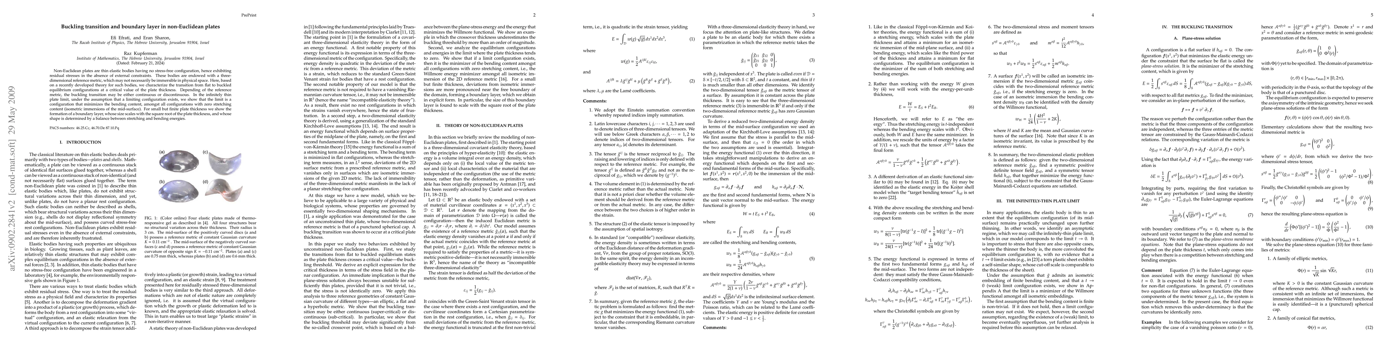 Non-Euclidean plates are thin elastic bodies having no stress-free configuration, hence exhibiting residual stresses in the absence of external constraints. These bodies are endowed with a three-dimensional reference metric, which may not necessarily be immersible in physical space. Here, based on a recently developed theory for such bodies, we characterize the transition from flat to buckled equilibrium configurations at a critical value of the plate thickness. Depending of the reference metric, the buckling transition may be either continuous or discontinuous. In the infinitely thin plate limit, under the assumption that a limiting configuration exists, we show that the limit is a configuration that minimizes the bending content, amongst all configurations with zero stretching content (isometric immersions of the mid-surface). For small but finite plate thickness we show the formation of a boundary layer, whose size scales with the square root of the plate thickness, and whose shape is determined by a balance between stretching and bending energies.