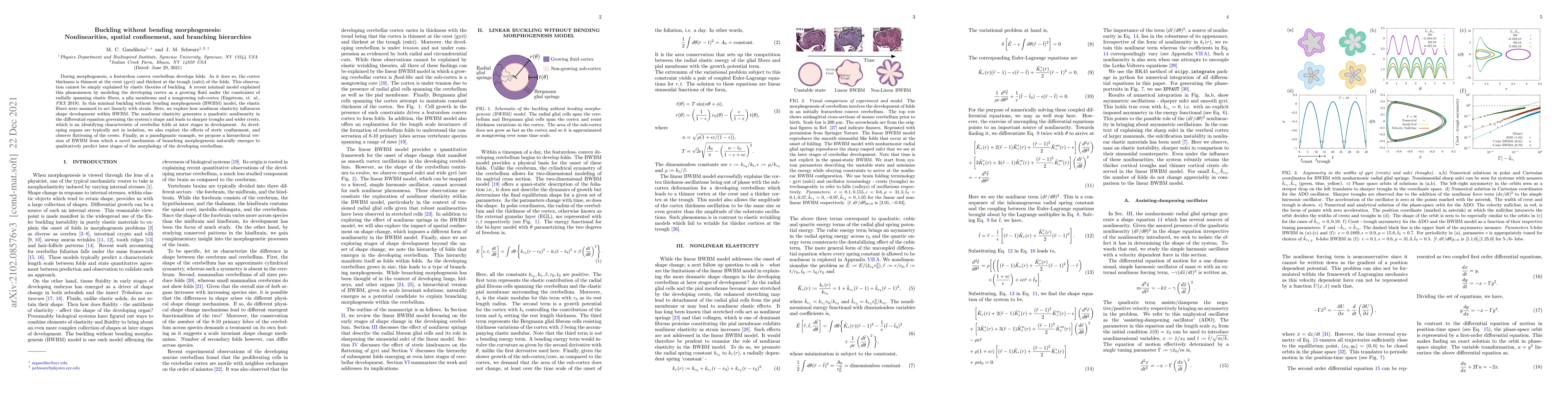 During morphogenesis, a featureless convex cerebellum develops folds. As it does so, the cortex thickness is thinnest at the crest (gyri) and thickest at the trough (sulci) of the folds. This observation cannot be simply explained by elastic theories of buckling. A recent minimal model explained this phenomenon by modeling the developing cortex as a growing fluid under the constraints of radially spanning elastic fibers, a plia membrane and a nongrowing sub-cortex (Engstrom, et. al., PRX 2019). In this minimal buckling without bending morphogenesis (BWBM) model, the elastic fibers were assumed to act linearly with strain. Here, we explore how nonlinear elasticity influences shape development within BWBM. The nonlinear elasticity generates a quadratic nonlinearity in the differential equation governing the system's shape and leads to sharper troughs and wider crests, which is an identifying characteristic of cerebellar folds at later stages in development. As developing organs are typically not in isolation, we also explore the effects of steric confinement, and observe flattening of the crests. Finally, as a paradigmatic example, we propose a hierarchical version of BWBM from which a novel mechanism of branching morphogenesis naturally emerges to qualitatively predict later stages of the morphology of the developing cerebellum.