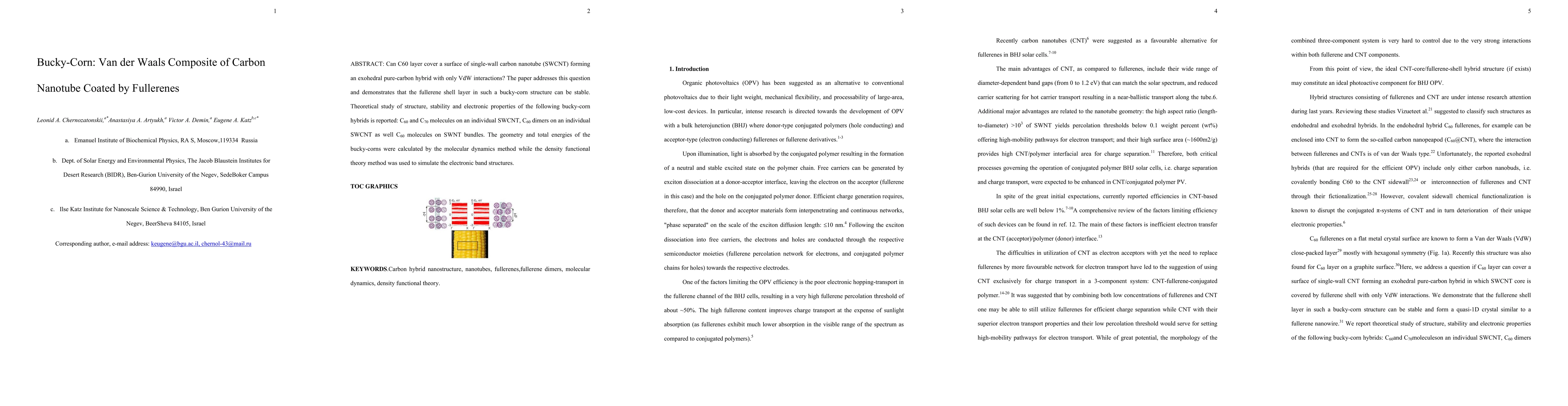 Can C60 layer cover a surface of single-wall carbon nanotube (SWCNT) forming an exohedral pure-carbon hybrid with only VdW interactions? The paper addresses this question and demonstrates that the fullerene shell layer in such a bucky-corn structure can be stable. Theoretical study of structure, stability and electronic properties of the following bucky-corn hybrids is reported: C60 and C70 molecules on an individual SWCNT, C60 dimers on an individual SWCNT as well C60 molecules on SWNT bundles. The geometry and total energies of the bucky-corns were calculated by the molecular dynamics method while the density functional theory method was used to simulate the electronic band structures.