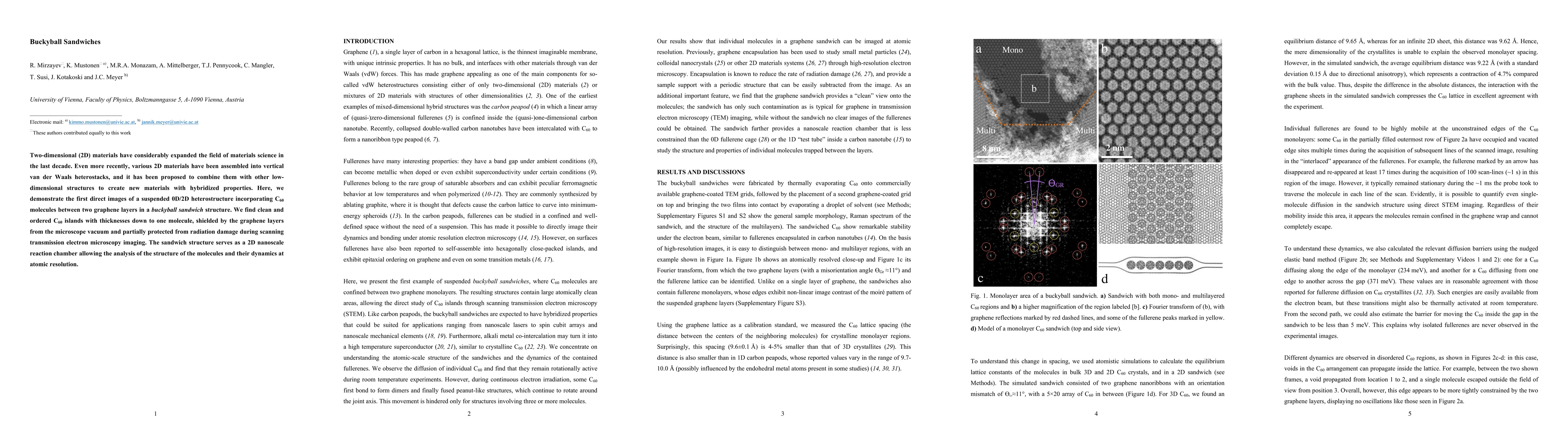 Two-dimensional (2D) materials have considerably expanded the field of materials science in the last decade. Even more recently, various 2D materials have been assembled into vertical van der Waals heterostacks, and it has been proposed to combine them with other low- dimensional structures to create new materials with hybridized properties. Here, we demonstrate the first direct images of a suspended 0D/2D heterostructure incorporating $C_{60}$ molecules between two graphene layers in a buckyball sandwich structure. We find clean and ordered $C_{60}$ islands with thicknesses down to one molecule, shielded by the graphene layers from the microscope vacuum and partially protected from radiation damage during scanning transmission electron microscopy imaging. The sandwich structure serves as a 2D nanoscale reaction chamber allowing the analysis of the structure of the molecules and their dynamics at atomic resolution.