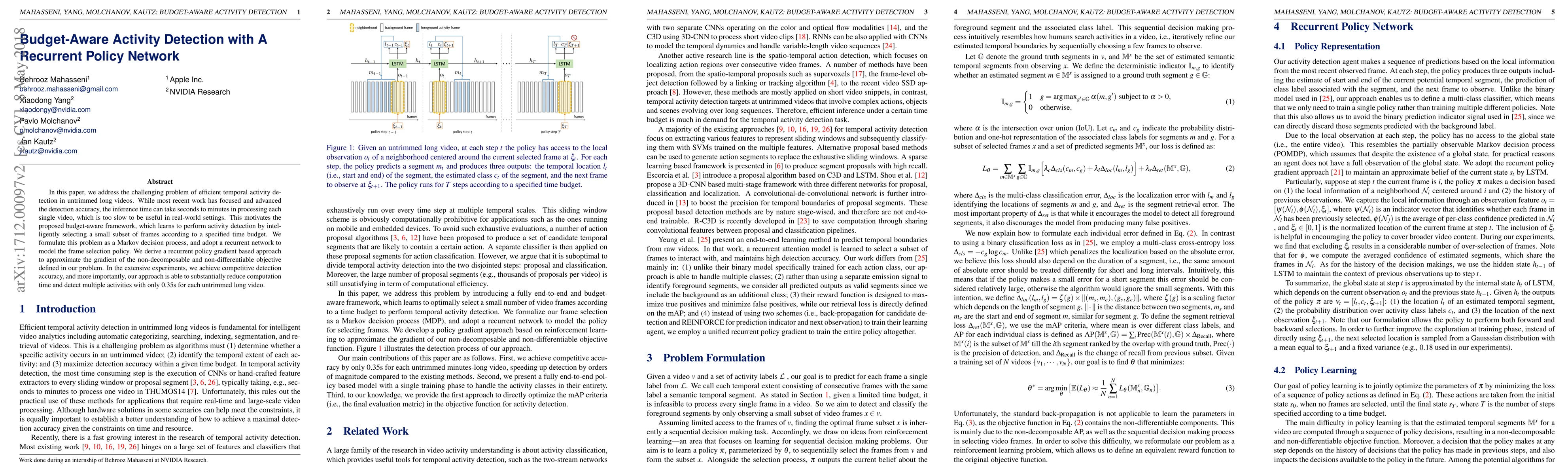 This paper proposes a budget-aware framework for efficient temporal activity detection in long videos by selecting a subset of frames within a specified time budget. Using a recurrent policy network, the approach achieves competitive detection accuracy while significantly reducing computation time to 0.35s per video.