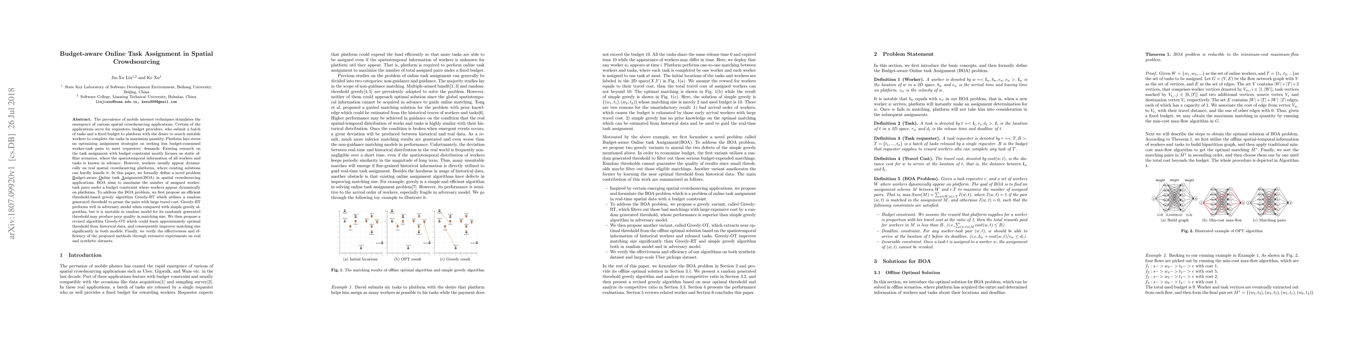 This paper introduces the Budget-aware Online Task Assignment (BOA) problem in spatial crowdsourcing, aiming to maximize task completion under budget constraints with dynamically appearing workers. The authors propose two algorithms: Greedy-RT, which uses a random threshold to prune high-cost pairs, and Greedy-OT, which learns optimal thresholds from historical data to improve matching. Experiments show both methods' effectiveness and efficiency.