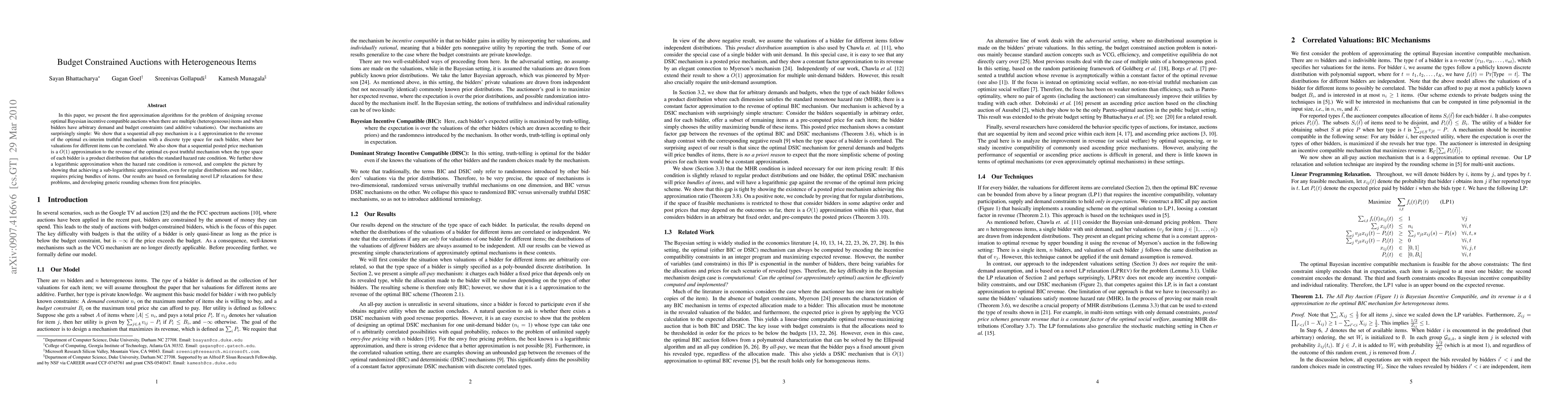 In this paper, we present the first approximation algorithms for the problem of designing revenue optimal Bayesian incentive compatible auctions when there are multiple (heterogeneous) items and when bidders can have arbitrary demand and budget constraints. Our mechanisms are surprisingly simple: We show that a sequential all-pay mechanism is a 4 approximation to the revenue of the optimal ex-interim truthful mechanism with discrete correlated type space for each bidder. We also show that a sequential posted price mechanism is a O(1) approximation to the revenue of the optimal ex-post truthful mechanism when the type space of each bidder is a product distribution that satisfies the standard hazard rate condition. We further show a logarithmic approximation when the hazard rate condition is removed, and complete the picture by showing that achieving a sub-logarithmic approximation, even for regular distributions and one bidder, requires pricing bundles of items. Our results are based on formulating novel LP relaxations for these problems, and developing generic rounding schemes from first principles. We believe this approach will be useful in other Bayesian mechanism design contexts.