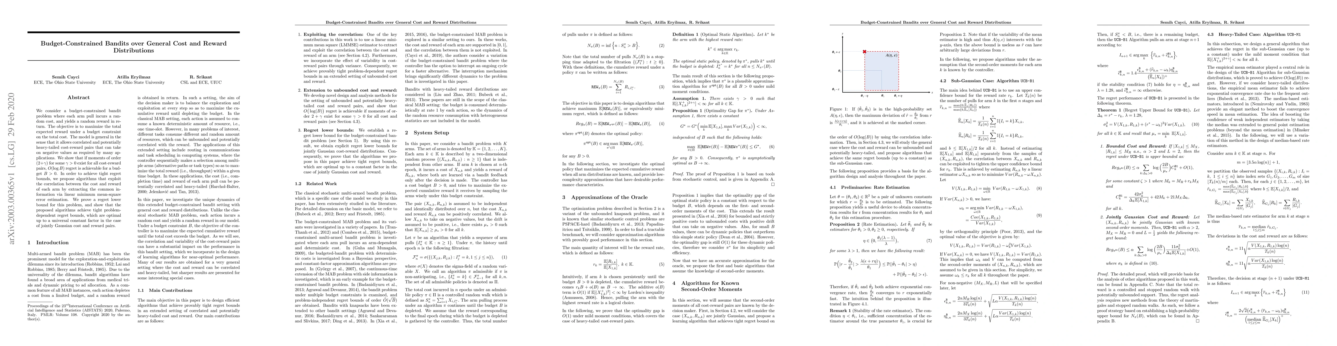 This paper addresses a budget-constrained multi-armed bandit problem with random costs and rewards, allowing for correlated and heavy-tailed distributions. It proposes algorithms achieving optimal $O(\log B)$ regret bounds under certain moment conditions, leveraging linear estimation to exploit cost-reward correlations.