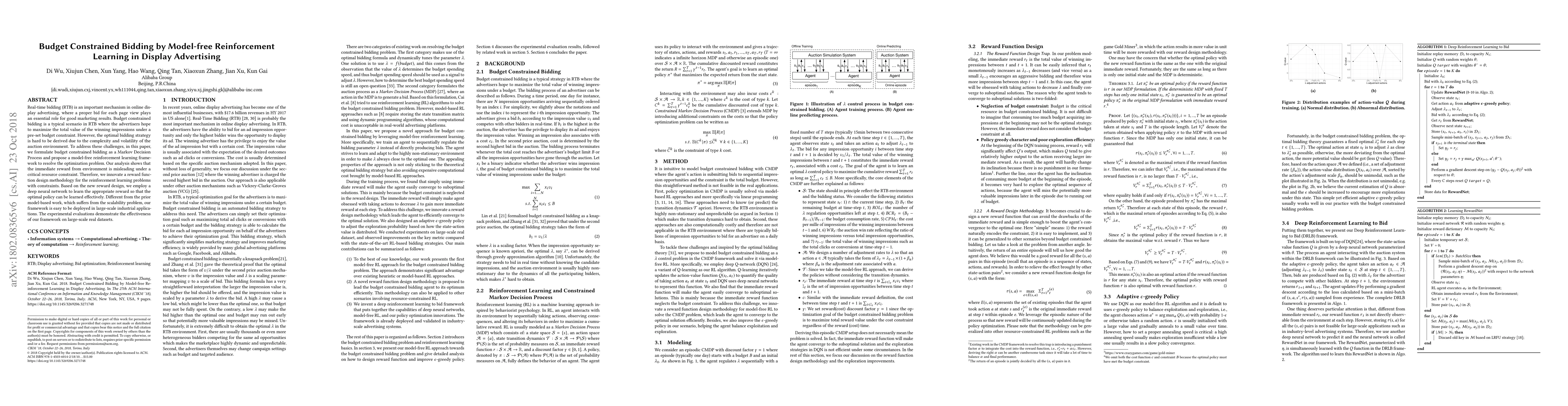 This paper proposes a model-free reinforcement learning framework to optimize budget-constrained bidding in real-time display advertising, addressing the complexity and volatility of the auction environment. It introduces an innovative reward function design to tackle misleading immediate rewards under resource constraints, demonstrating effectiveness on large-scale datasets.