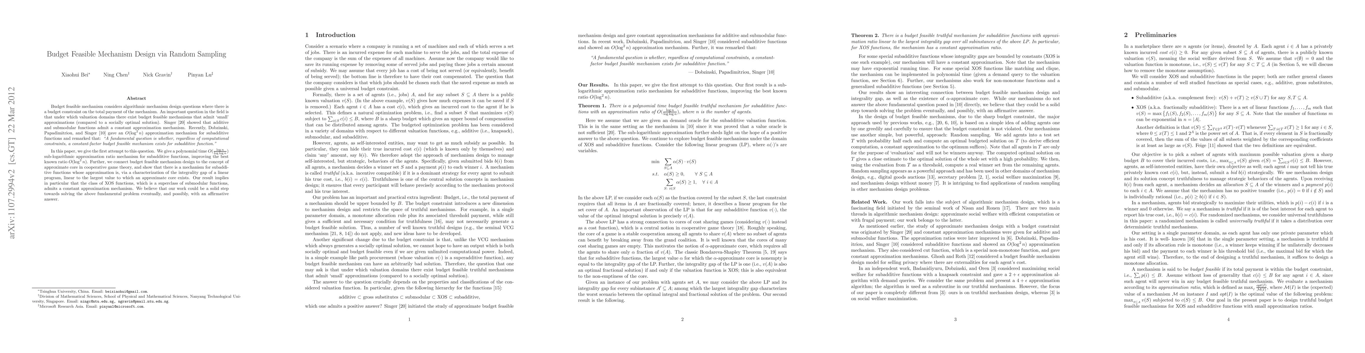 The paper presents a budget feasible mechanism design via random sampling for subadditive functions, improving the approximation ratio from O(log^2 n) to O(frac{log n}{log log n}). It connects budget feasible mechanism design to the approximate core in cooperative game theory and shows a mechanism for subadditive functions with an approximation ratio linear to the largest value of an approximate core.