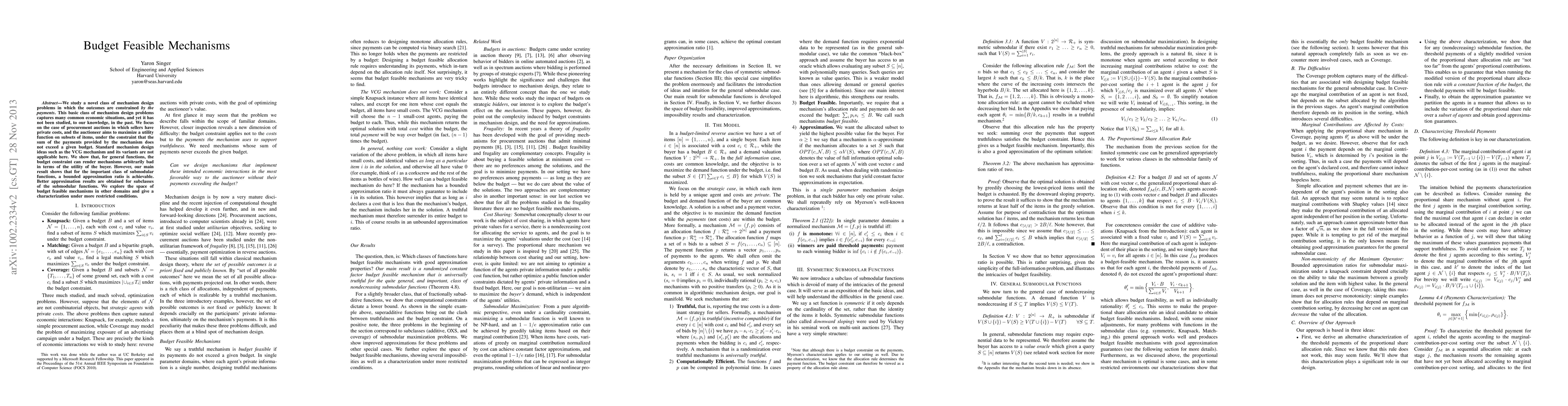 We study a novel class of mechanism design problems in which the outcomes are constrained by the payments. This basic class of mechanism design problems captures many common economic situations, and yet it has not been studied, to our knowledge, in the past. We focus on the case of procurement auctions in which sellers have private costs, and the auctioneer aims to maximize a utility function on subsets of items, under the constraint that the sum of the payments provided by the mechanism does not exceed a given budget. Standard mechanism design ideas such as the VCG mechanism and its variants are not applicable here. We show that, for general functions, the budget constraint can render mechanisms arbitrarily bad in terms of the utility of the buyer. However, our main result shows that for the important class of submodular functions, a bounded approximation ratio is achievable. Better approximation results are obtained for subclasses of the submodular functions. We explore the space of budget feasible mechanisms in other domains and give a characterization under more restricted conditions.