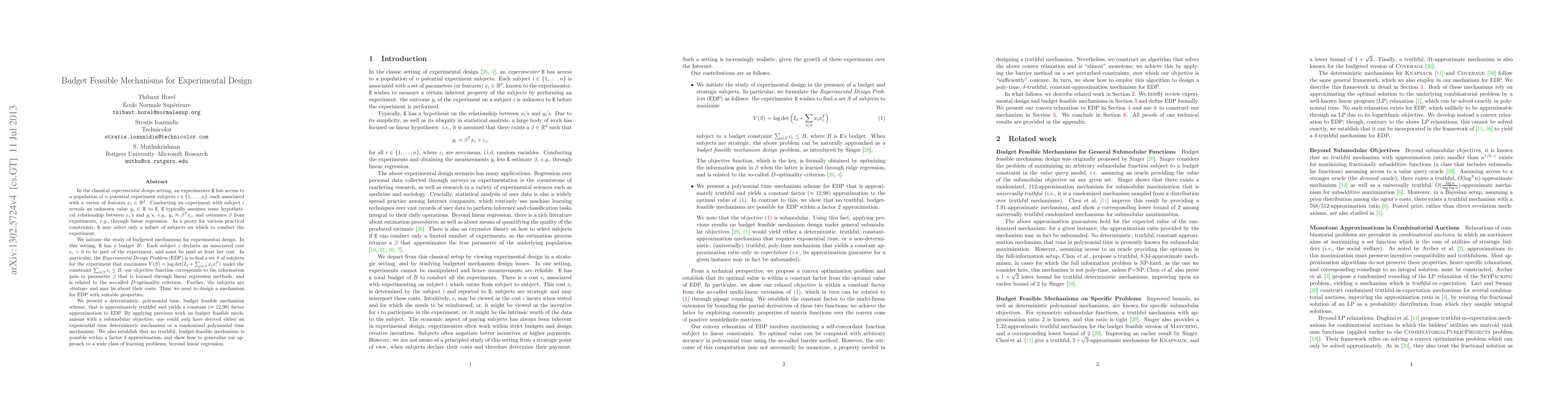 This paper explores budgeted mechanisms for experimental design, focusing on selecting a subset of subjects within a cost budget to maximize information gain for parameter estimation. It introduces a polynomial-time, budget-feasible mechanism that is approximately truthful and provides a constant factor approximation to the optimal selection problem, while proving the infeasibility of a better truthful algorithm within a factor 2 approximation.
