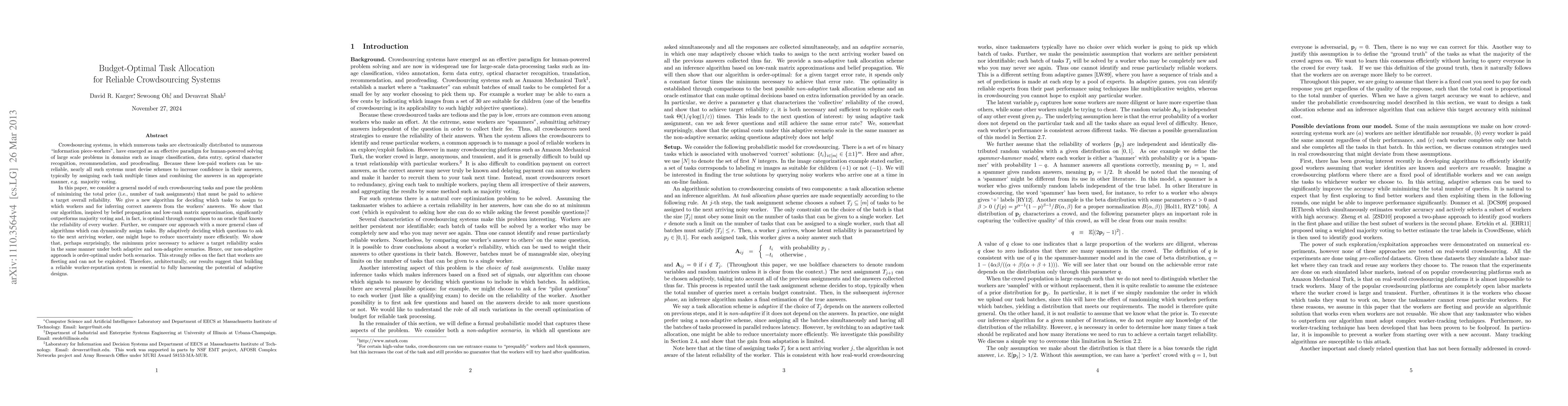 Crowdsourcing systems, in which numerous tasks are electronically distributed to numerous "information piece-workers", have emerged as an effective paradigm for human-powered solving of large scale problems in domains such as image classification, data entry, optical character recognition, recommendation, and proofreading. Because these low-paid workers can be unreliable, nearly all such systems must devise schemes to increase confidence in their answers, typically by assigning each task multiple times and combining the answers in an appropriate manner, e.g. majority voting. In this paper, we consider a general model of such crowdsourcing tasks and pose the problem of minimizing the total price (i.e., number of task assignments) that must be paid to achieve a target overall reliability. We give a new algorithm for deciding which tasks to assign to which workers and for inferring correct answers from the workers' answers. We show that our algorithm, inspired by belief propagation and low-rank matrix approximation, significantly outperforms majority voting and, in fact, is optimal through comparison to an oracle that knows the reliability of every worker. Further, we compare our approach with a more general class of algorithms which can dynamically assign tasks. By adaptively deciding which questions to ask to the next arriving worker, one might hope to reduce uncertainty more efficiently. We show that, perhaps surprisingly, the minimum price necessary to achieve a target reliability scales in the same manner under both adaptive and non-adaptive scenarios. Hence, our non-adaptive approach is order-optimal under both scenarios. This strongly relies on the fact that workers are fleeting and can not be exploited. Therefore, architecturally, our results suggest that building a reliable worker-reputation system is essential to fully harnessing the potential of adaptive designs.