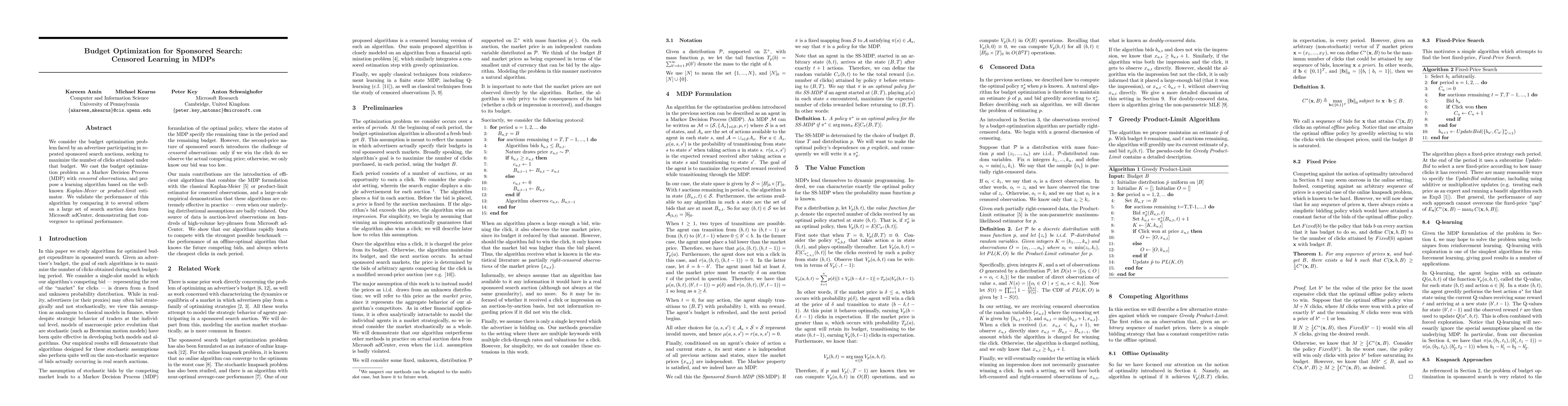 We consider the budget optimization problem faced by an advertiser participating in repeated sponsored search auctions, seeking to maximize the number of clicks attained under that budget. We cast the budget optimization problem as a Markov Decision Process (MDP) with censored observations, and propose a learning algorithm based on the wellknown Kaplan-Meier or product-limit estimator. We validate the performance of this algorithm by comparing it to several others on a large set of search auction data from Microsoft adCenter, demonstrating fast convergence to optimal performance.