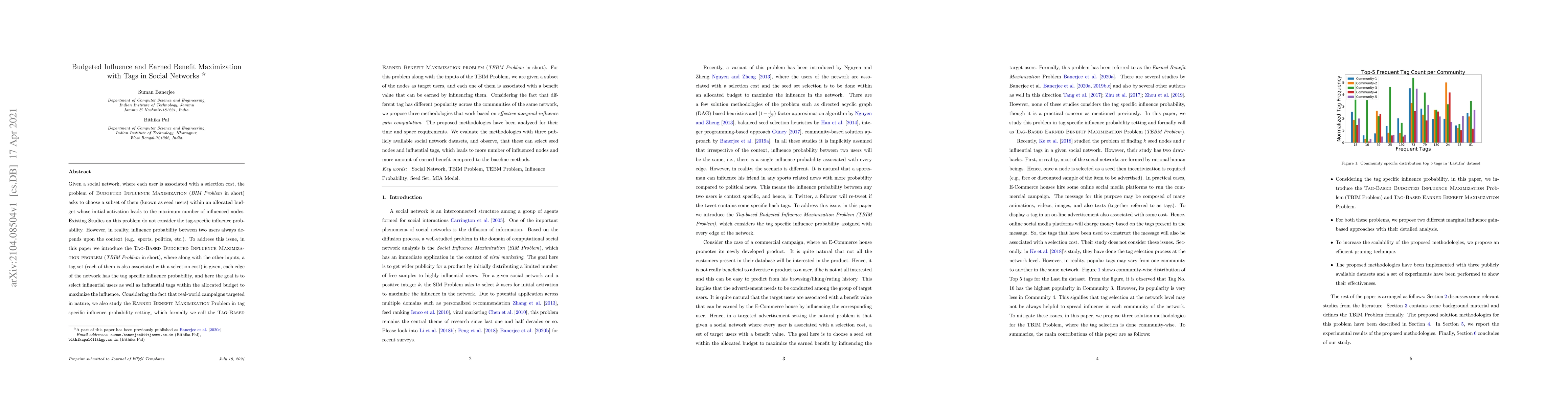 This paper introduces the Tag-Based Budgeted Influence Maximization problem (TBIM Problem), aiming to select seed users and influential tags within a budget to maximize influence in social networks, considering tag-specific influence probabilities. It also explores the Tag-Based Earned Benefit Maximization problem (TEBM Problem), optimizing influence to maximize earned benefits from target users, and proposes three methodologies based on effective marginal influence gain computation.
