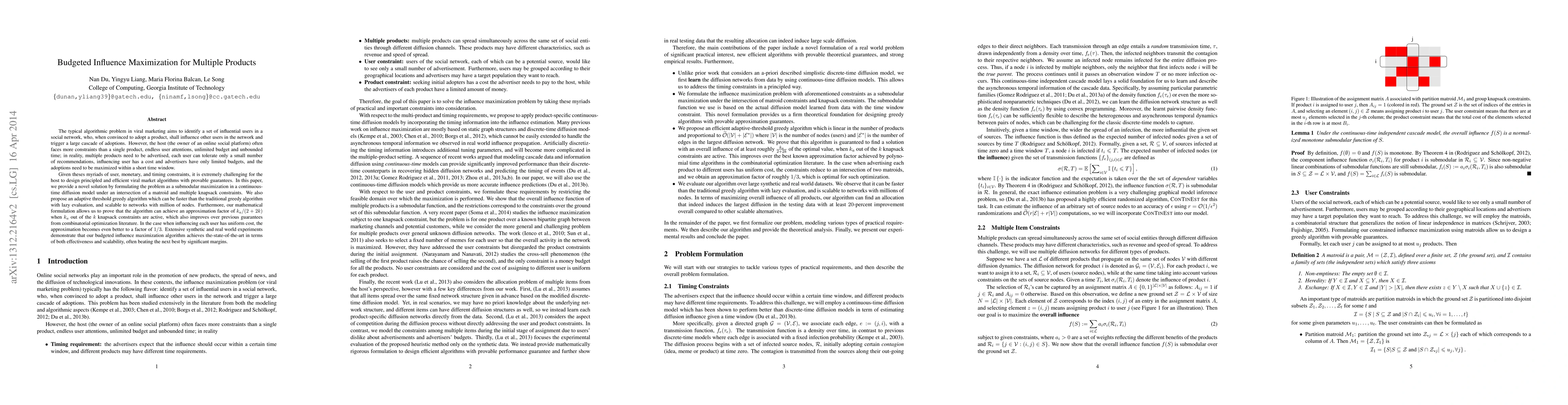 This paper proposes a novel algorithm for budgeted influence maximization in viral marketing, addressing the challenge of promoting multiple products under constraints like limited budgets, user attention, and time. The authors formulate the problem as submodular maximization within a continuous-time diffusion model, introducing an adaptive threshold greedy algorithm that outperforms traditional methods and scales to large networks. The algorithm achieves an improved approximation factor, especially when costs are uniform, and outperforms existing approaches in both effectiveness and scalability.