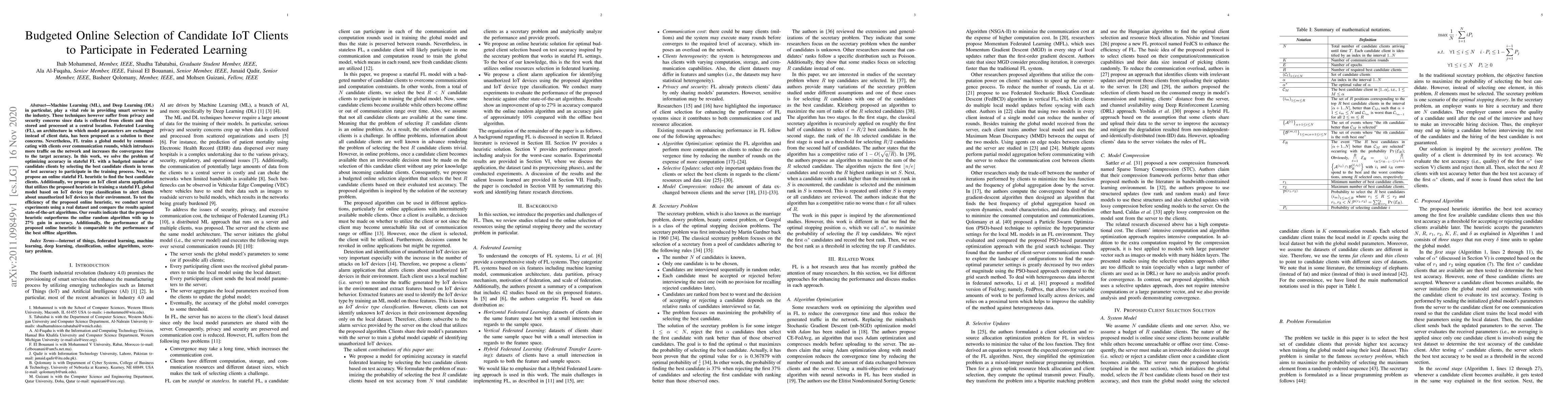 Machine Learning (ML), and Deep Learning (DL) in particular, play a vital role in providing smart services to the industry. These techniques however suffer from privacy and security concerns since data is collected from clients and then stored and processed at a central location. Federated Learning (FL), an architecture in which model parameters are exchanged instead of client data, has been proposed as a solution to these concerns. Nevertheless, FL trains a global model by communicating with clients over communication rounds, which introduces more traffic on the network and increases the convergence time to the target accuracy. In this work, we solve the problem of optimizing accuracy in stateful FL with a budgeted number of candidate clients by selecting the best candidate clients in terms of test accuracy to participate in the training process. Next, we propose an online stateful FL heuristic to find the best candidate clients. Additionally, we propose an IoT client alarm application that utilizes the proposed heuristic in training a stateful FL global model based on IoT device type classification to alert clients about unauthorized IoT devices in their environment. To test the efficiency of the proposed online heuristic, we conduct several experiments using a real dataset and compare the results against state-of-the-art algorithms. Our results indicate that the proposed heuristic outperforms the online random algorithm with up to 27% gain in accuracy. Additionally, the performance of the proposed online heuristic is comparable to the performance of the best offline algorithm.