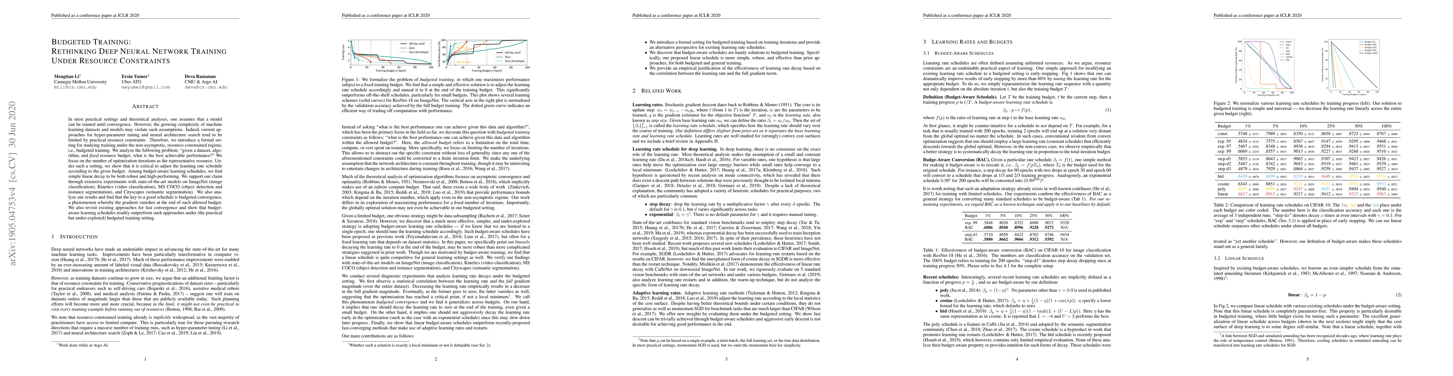 This paper introduces budgeted training, a framework for optimizing deep neural networks under practical resource constraints, focusing on the number of optimization iterations. It demonstrates that adjusting the learning rate schedule, particularly simple linear decay, is crucial for achieving optimal performance within a given budget, supported by experiments on various datasets.