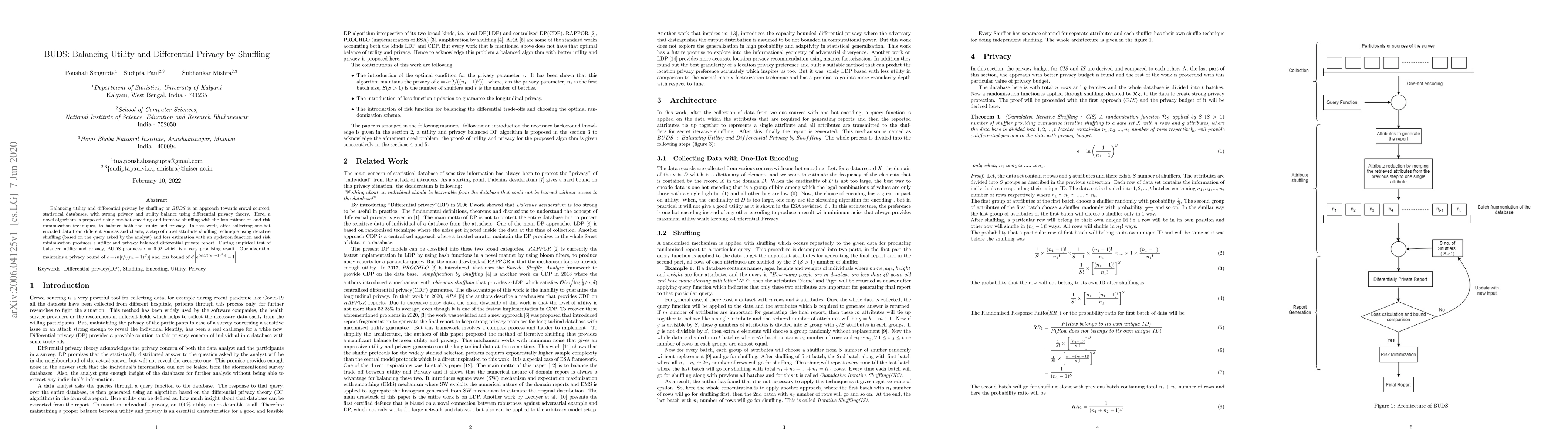 Balancing utility and differential privacy by shuffling or \textit{BUDS} is an approach towards crowd-sourced, statistical databases, with strong privacy and utility balance using differential privacy theory. Here, a novel algorithm is proposed using one-hot encoding and iterative shuffling with the loss estimation and risk minimization techniques, to balance both the utility and privacy. In this work, after collecting one-hot encoded data from different sources and clients, a step of novel attribute shuffling technique using iterative shuffling (based on the query asked by the analyst) and loss estimation with an updation function and risk minimization produces a utility and privacy balanced differential private report. During empirical test of balanced utility and privacy, BUDS produces $\epsilon = 0.02$ which is a very promising result. Our algorithm maintains a privacy bound of $\epsilon = ln [t/((n_1 - 1)^S)]$ and loss bound of $c' \bigg|e^{ln[t/((n_1 - 1)^S)]} - 1\bigg|$.