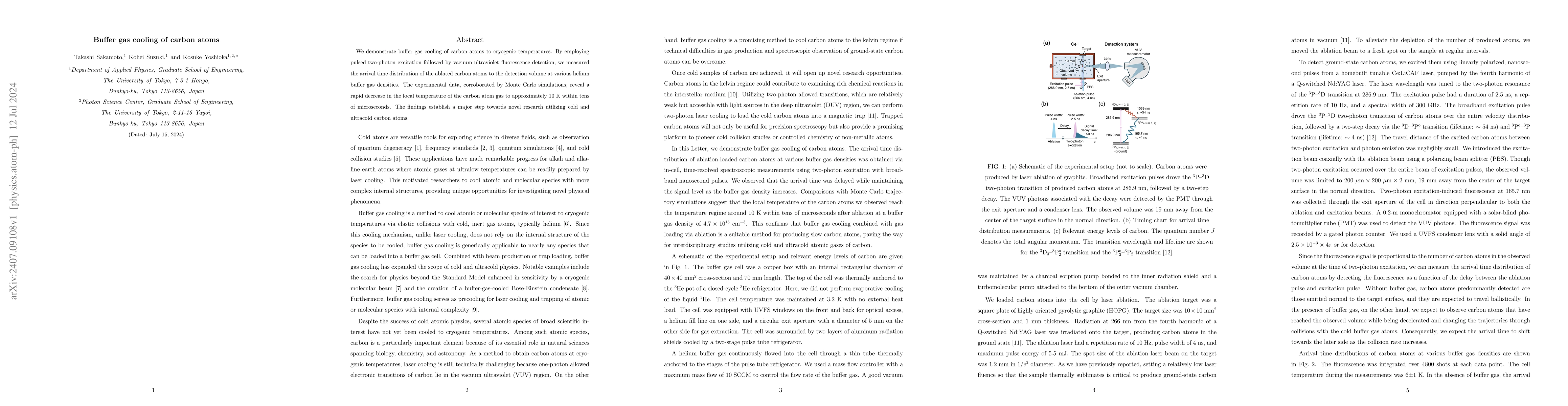 This study demonstrates the successful buffer gas cooling of carbon atoms to cryogenic temperatures using pulsed two-photon excitation and vacuum ultraviolet fluorescence detection. The rapid decrease in local temperature to ~10 K within tens of microseconds indicates significant progress towards utilizing cold carbon atoms in future research.