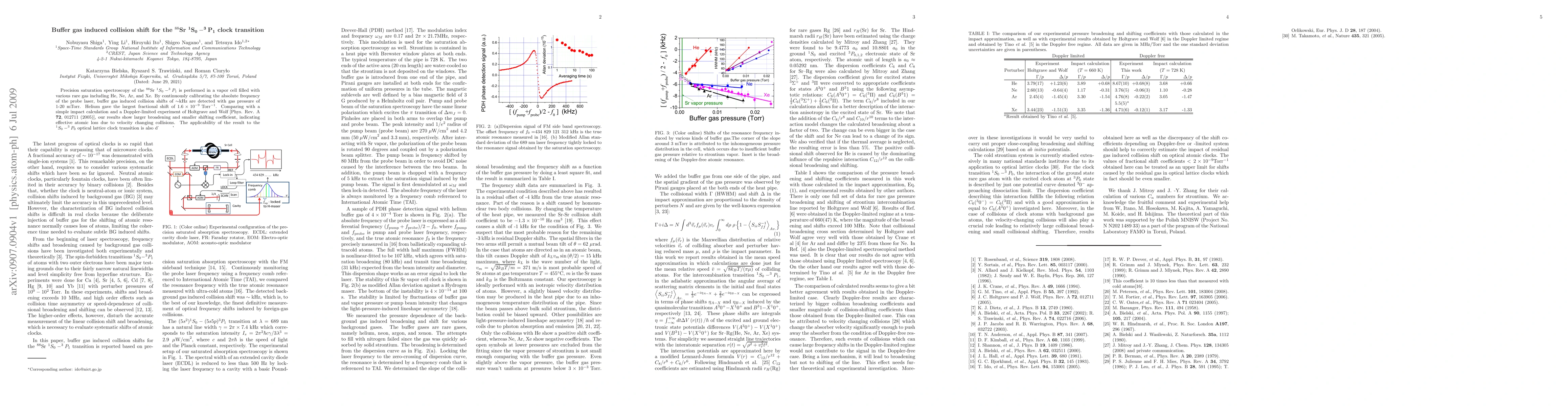 Precision saturation spectroscopy of the $^{88}{\rm Sr} ^1S_0-^3P_1$ is performed in a vapor cell filled with various rare gas including He, Ne, Ar, and Xe. By continuously calibrating the absolute frequency of the probe laser, buffer gas induced collision shifts of $\sim $kHz are detected with gas pressure of 1-20 mTorr. Helium gave the largest fractional shift of $1.6 \times 10^{-9} {\rm Torr}^{-1}$. Comparing with a simple impact calculation and a Doppler-limited experiment of Holtgrave and Wolf [Phys. Rev. A {\bf 72}, 012711 (2005)], our results show larger broadening and smaller shifting coefficient, indicating effective atomic loss due to velocity changing collisions. The applicability of the result to the $^1S_0-^3P_0$ optical lattice clock transition is also discussed.