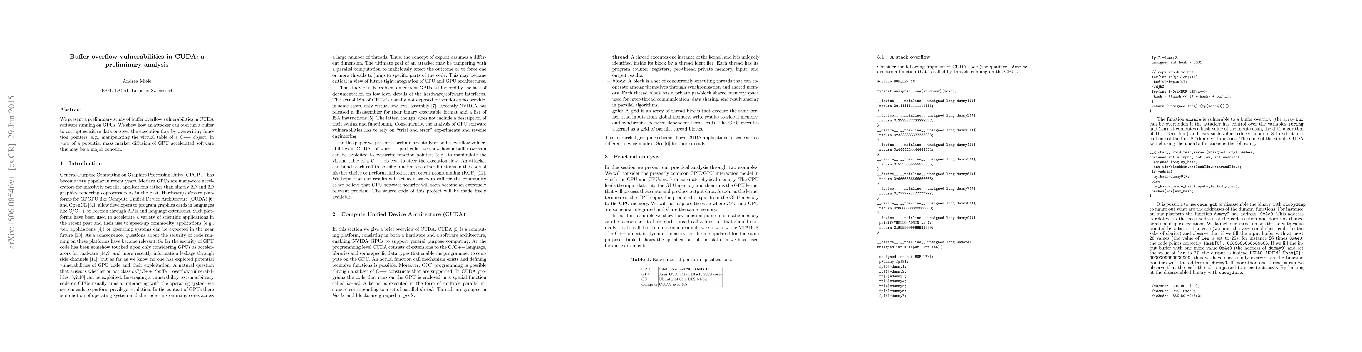 This study investigates buffer overflow vulnerabilities in CUDA software on GPUs, demonstrating how attackers can exploit these to corrupt data or manipulate execution flow by overwriting function pointers, posing significant security risks as GPU-accelerated software becomes more widespread.