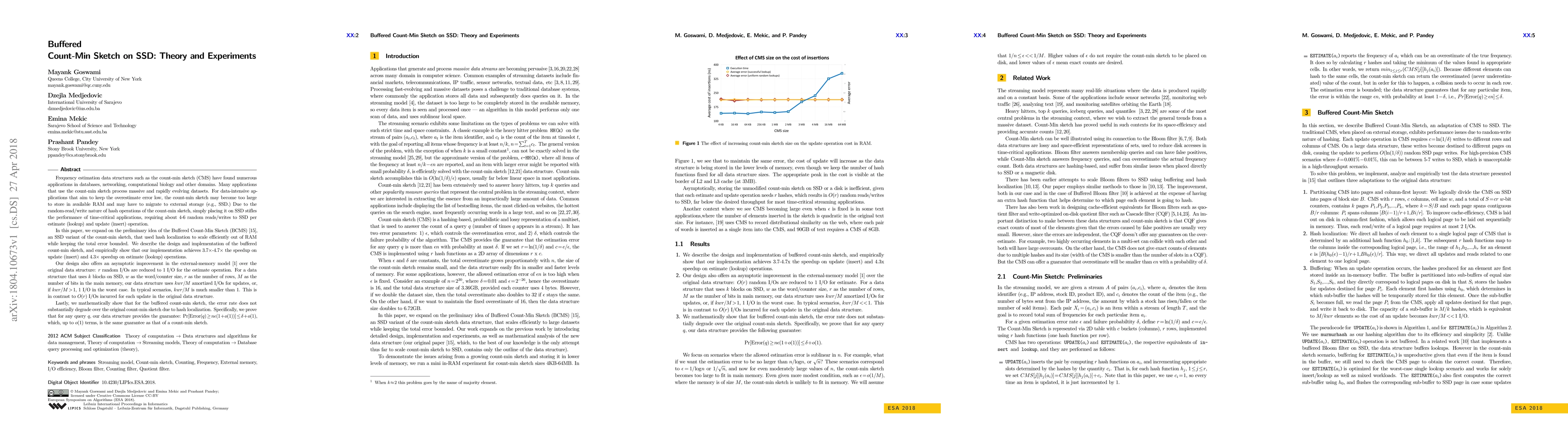 Frequency estimation data structures such as the count-min sketch (CMS) have found numerous applications in databases, networking, computational biology and other domains. Many applications that use the count-min sketch process massive and rapidly evolving datasets. For data-intensive applications that aim to keep the overestimate error low, the count-min sketch may become too large to store in available RAM and may have to migrate to external storage (e.g., SSD.) Due to the random-read/write nature of hash operations of the count-min sketch, simply placing it on SSD stifles the performance of time-critical applications, requiring about 4-6 random reads/writes to SSD per estimate (lookup) and update (insert) operation. In this paper, we expand on the preliminary idea of the Buffered Count-Min Sketch (BCMS) [15], an SSD variant of the count-min sketch, that used hash localization to scale efficiently out of RAM while keeping the total error bounded. We describe the design and implementation of the buffered count-min sketch, and empirically show that our implementation achieves 3.7x-4.7x the speedup on update (insert) and 4.3x speedup on estimate (lookup) operations. Our design also offers an asymptotic improvement in the external-memory model [1] over the original data structure: r random I/Os are reduced to 1 I/O for the estimate operation. For a data structure that uses k blocks on SSD, was the word/counter size, r as the number of rows, M as the number of bits in the main memory, our data structure uses kwr/M amortized I/Os for updates, or, if kwr/M >1, 1 I/O in the worst case. In typical scenarios, kwr/M is much smaller than 1. This is in contrast to O(r) I/Os incurred for each update in the original data structure.