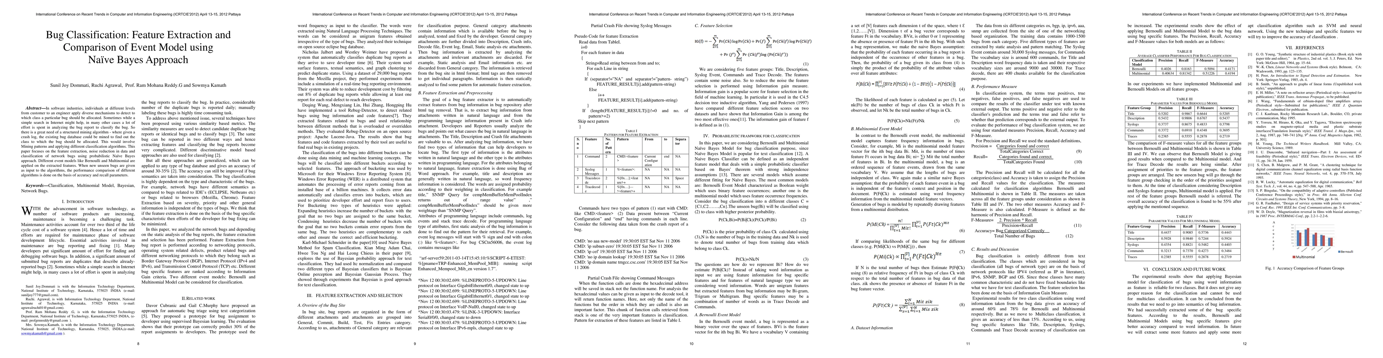 In software industries, individuals at different levels from customer to an engineer apply diverse mechanisms to detect to which class a particular bug should be allocated. Sometimes while a simple search in Internet might help, in many other cases a lot of effort is spent in analyzing the bug report to classify the bug. So there is a great need of a structured mining algorithm - where given a crash log, the existing bug database could be mined to find out the class to which the bug should be allocated. This would involve Mining patterns and applying different classification algorithms. This paper focuses on the feature extraction, noise reduction in data and classification of network bugs using probabilistic Na\"ive Bayes approach. Different event models like Bernoulli and Multinomial are applied on the extracted features. When new, unseen bugs are given as input to the algorithms, the performance comparison of different algorithms is done on the basis of accuracy and recall parameters.