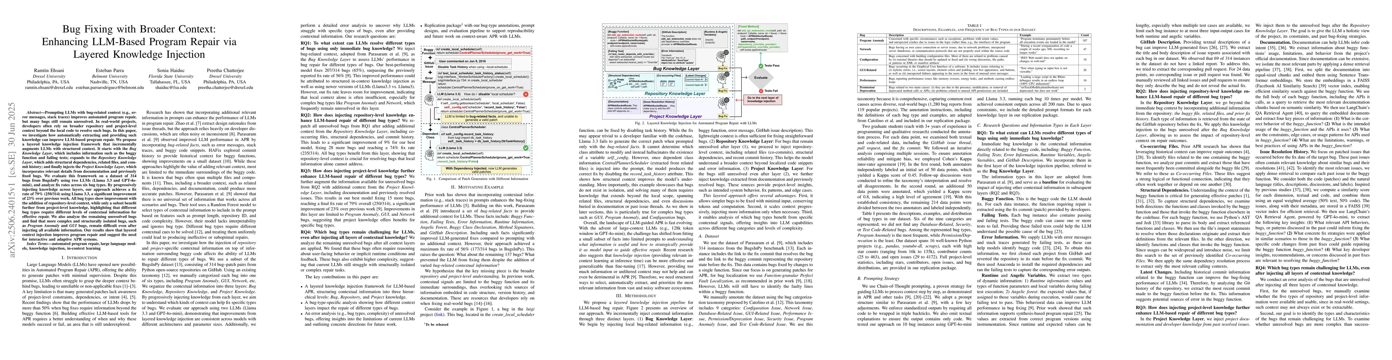 Prompting LLMs with bug-related context (e.g., error messages, stack traces) improves automated program repair, but many bugs still remain unresolved. In real-world projects, developers often rely on broader repository and project-level context beyond the local code to resolve such bugs. In this paper, we investigate how automatically extracting and providing such knowledge can improve LLM-based program repair. We propose a layered knowledge injection framework that incrementally augments LLMs with structured context. It starts with the Bug Knowledge Layer, which includes information such as the buggy function and failing tests; expands to the Repository Knowledge Layer, which adds structural dependencies, related files, and commit history; and finally injects the Project Knowledge Layer, which incorporates relevant details from documentation and previously fixed bugs. We evaluate this framework on a dataset of 314 bugs from BugsInPy using two LLMs (Llama 3.3 and GPT-4o-mini), and analyze fix rates across six bug types. By progressively injecting knowledge across layers, our approach achieves a fix rate of 79% (250/314) using Llama 3.3, a significant improvement of 23% over previous work. All bug types show improvement with the addition of repository-level context, while only a subset benefit further from project-level knowledge, highlighting that different bug types require different levels of contextual information for effective repair. We also analyze the remaining unresolved bugs and find that more complex and structurally isolated bugs, such as Program Anomaly and GUI bugs, remain difficult even after injecting all available information. Our results show that layered context injection improves program repair and suggest the need for interactive and adaptive APR systems.
