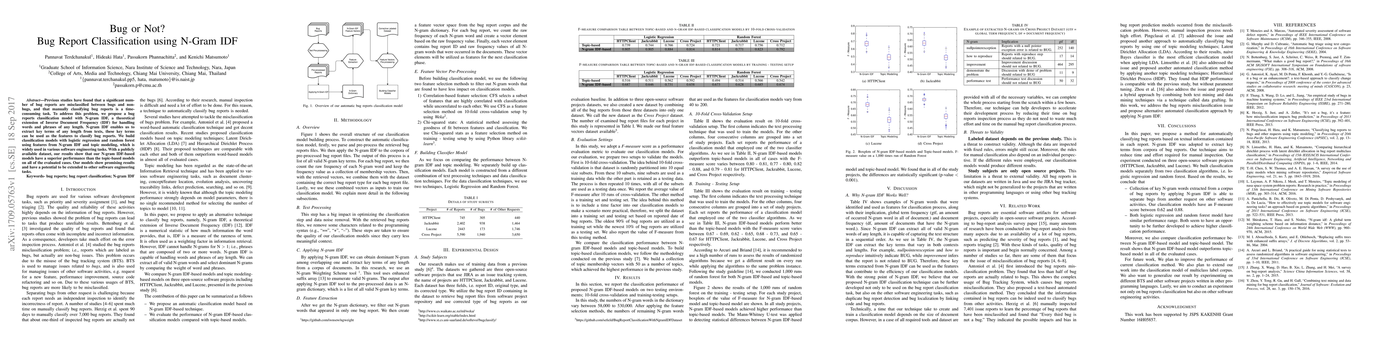 This paper proposes a bug report classification model using N-gram IDF to improve the accuracy of distinguishing between bug and non-bug reports. The N-gram IDF method extracts key terms of varying lengths, which are used to build classification models with logistic regression and random forest, outperforming topic modeling-based models.