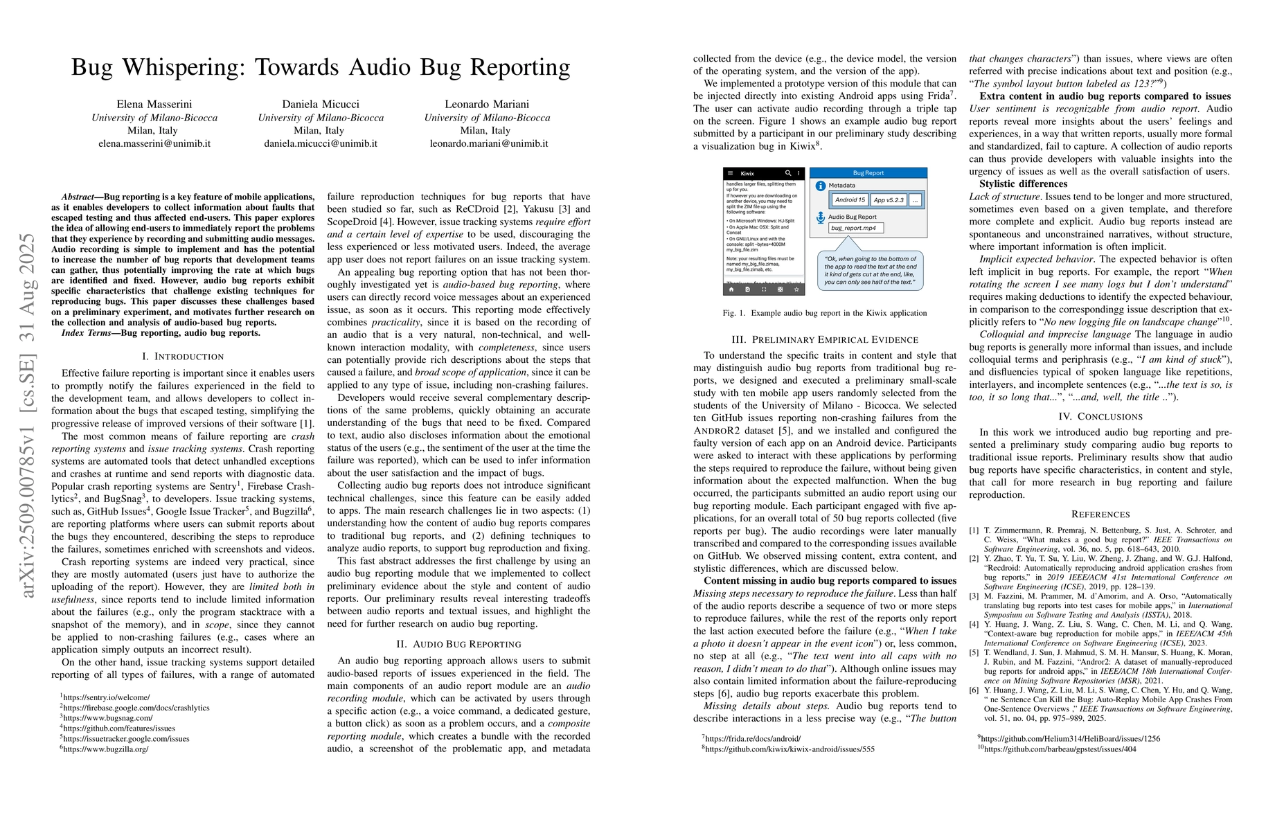 Bug reporting is a key feature of mobile applications, as it enables developers to collect information about faults that escaped testing and thus affected end-users. This paper explores the idea of allowing end-users to immediately report the problems that they experience by recording and submitting audio messages. Audio recording is simple to implement and has the potential to increase the number of bug reports that development teams can gather, thus potentially improving the rate at which bugs are identified and fixed. However, audio bug reports exhibit specific characteristics that challenge existing techniques for reproducing bugs. This paper discusses these challenges based on a preliminary experiment, and motivates further research on the collection and analysis of audio-based bug reports