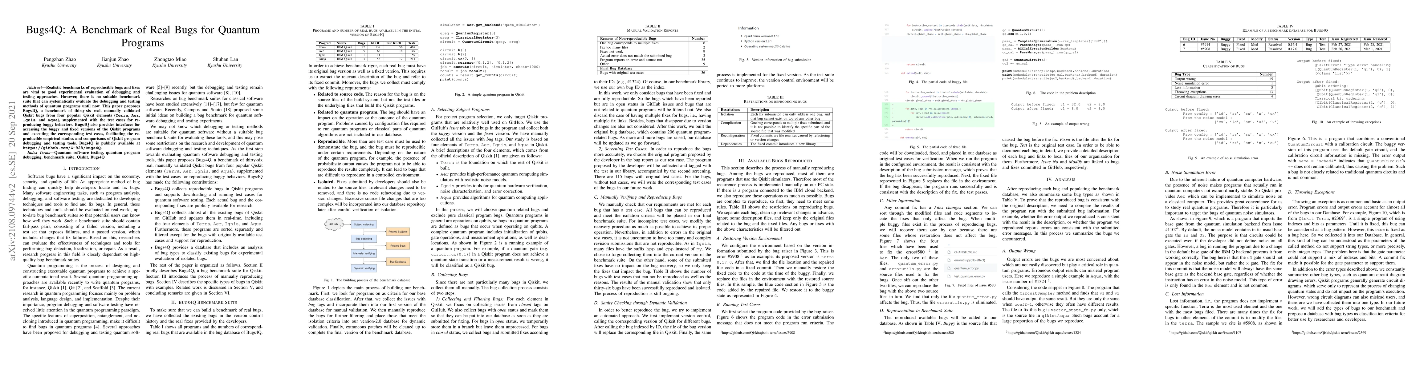 Bugs4Q introduces a benchmark of thirty-six real, validated bugs from popular Qiskit elements, along with test cases for reproducible evaluation. It aims to facilitate empirical studies and comparisons of debugging and testing tools for quantum programs.