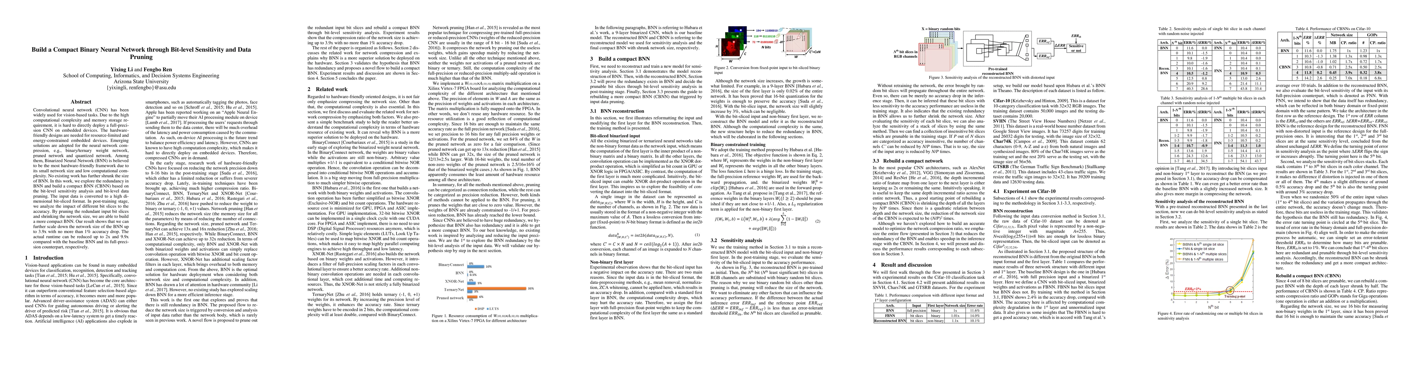 Convolutional neural network (CNN) has been widely used for vision-based tasks. Due to the high computational complexity and memory storage requirement, it is hard to directly deploy a full-precision CNN on embedded devices. The hardware-friendly designs are needed for re-source-limited and energy-constrained embed-ded devices. Emerging solutions are adopted for the neural network compression, e.g., bina-ry/ternary weight network, pruned network and quantized network. Among them, Binarized Neural Network (BNN) is believed to be the most hardware-friendly framework due to its small network size and low computational com-plexity. No existing work has further shrunk the size of BNN. In this work, we explore the redun-dancy in BNN and build a compact BNN (CBNN) based on the bit-level sensitivity analy-sis and bit-level data pruning. The input data is converted to a high dimensional bit-sliced for-mat. In post-training stage, we analyze the im-pact of different bit slices to the accuracy. By pruning the redundant input bit slices and shrinking the network size, we are able to build a more compact BNN. Our result shows that we can further scale down the network size of the BNN up to 3.9x with no more than 1% accuracy drop. The actual runtime can be reduced up to 2x and 9.9x compared with the baseline BNN and its full-precision counterpart, respectively.