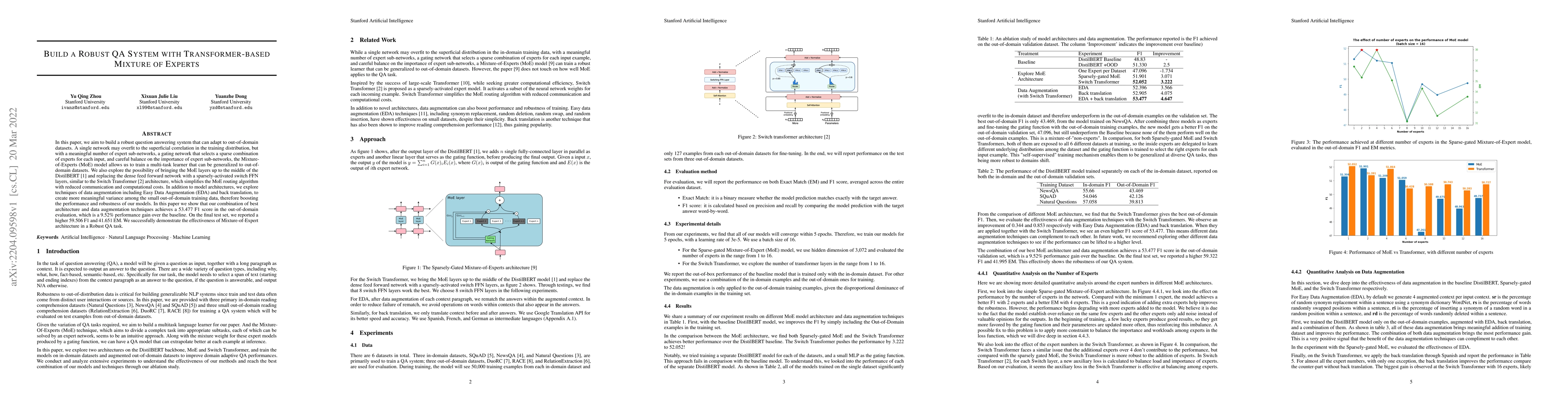 In this paper, we aim to build a robust question answering system that can adapt to out-of-domain datasets. A single network may overfit to the superficial correlation in the training distribution, but with a meaningful number of expert sub-networks, a gating network that selects a sparse combination of experts for each input, and careful balance on the importance of expert sub-networks, the Mixture-of-Experts (MoE) model allows us to train a multi-task learner that can be generalized to out-of-domain datasets. We also explore the possibility of bringing the MoE layers up to the middle of the DistilBERT and replacing the dense feed-forward network with a sparsely-activated switch FFN layers, similar to the Switch Transformer architecture, which simplifies the MoE routing algorithm with reduced communication and computational costs. In addition to model architectures, we explore techniques of data augmentation including Easy Data Augmentation (EDA) and back translation, to create more meaningful variance among the small out-of-domain training data, therefore boosting the performance and robustness of our models. In this paper, we show that our combination of best architecture and data augmentation techniques achieves a 53.477 F1 score in the out-of-domain evaluation, which is a 9.52% performance gain over the baseline. On the final test set, we reported a higher 59.506 F1 and 41.651 EM. We successfully demonstrate the effectiveness of Mixture-of-Expert architecture in a Robust QA task.