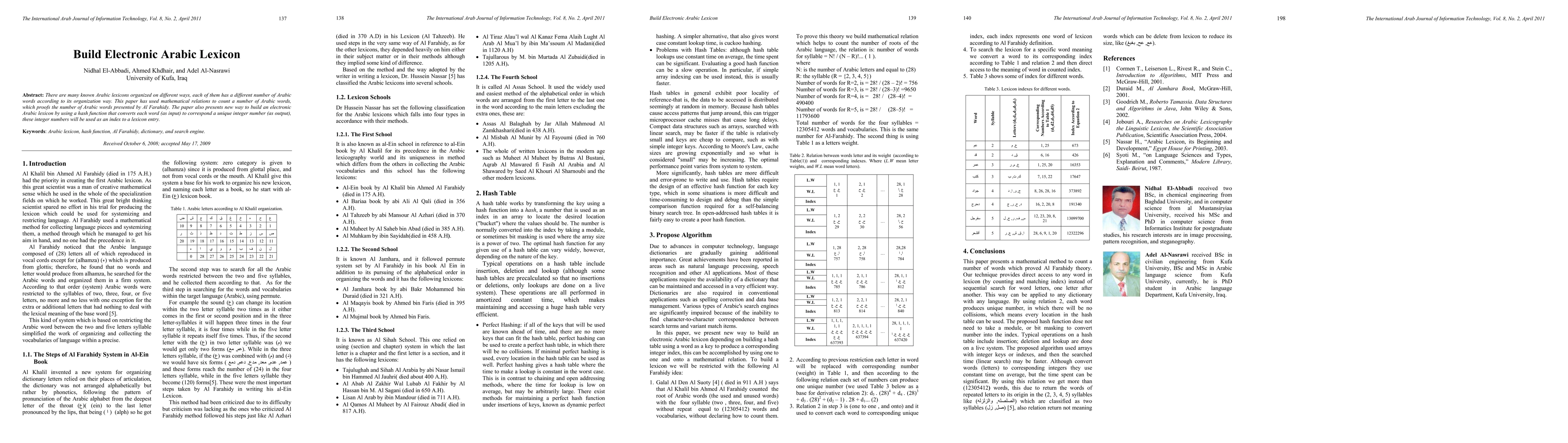 This paper mathematically verifies the number of Arabic words proposed by Al Farahidy and introduces a novel method for constructing an electronic Arabic lexicon using a hash function to uniquely index lexicon entries.