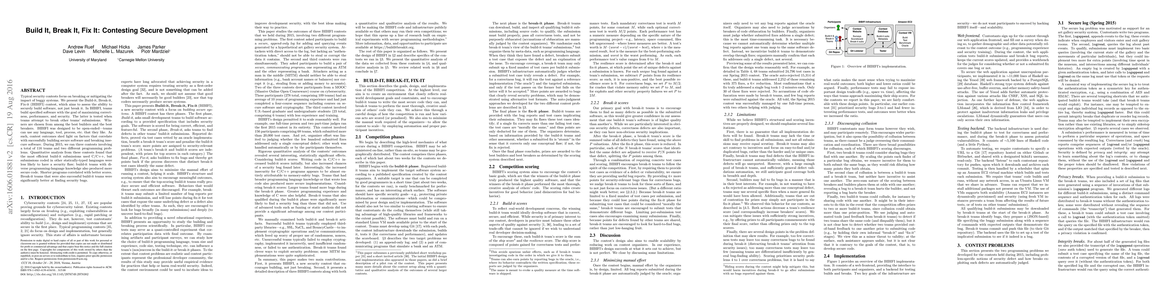 Typical security contests focus on breaking or mitigating the impact of buggy systems. We present the Build-it Break-it Fix-it BIBIFI contest which aims to assess the ability to securely build software not just break it. In BIBIFI teams build specified software with the goal of maximizing correctness performance and security. The latter is tested when teams attempt to break other teams submissions. Winners are chosen from among the best builders and the best breakers. BIBIFI was designed to be open-ended - teams can use any language tool process etc. that they like. As such contest outcomes shed light on factors that correlate with successfully building secure software and breaking insecure software. During we ran three contests involving a total of teams and two different programming problems. Quantitative analysis from these contests found that the most efficient build-it submissions used CC but submissions coded in a statically-typed language were less likely to have a security flaw build-it teams with diverse programming-language knowledge also produced more secure code. Shorter programs correlated with better scores. Break-it teams that were also build-it teams were significantly better at finding security bugs.