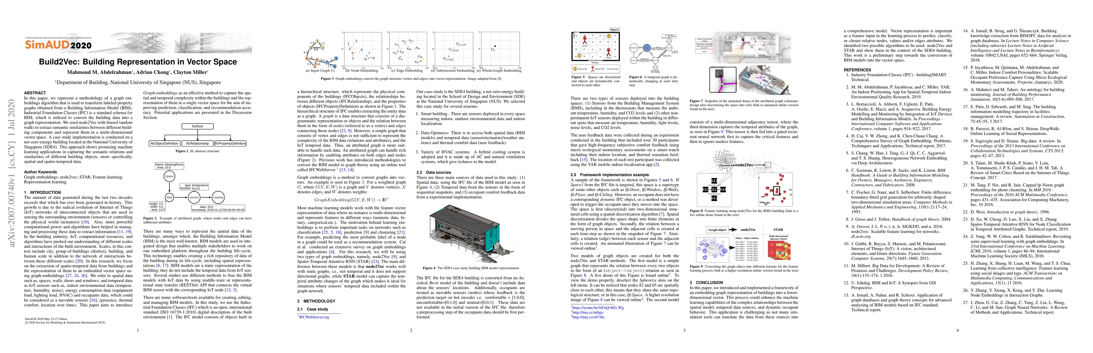 In this paper, we represent a methodology of a graph embeddings algorithm that is used to transform labeled property graphs obtained from a Building Information Model (BIM). Industrial Foundation Classes (IFC) is a standard schema for BIM, which is utilized to convert the building data into a graph representation. We used node2Vec with biased random walks to extract semantic similarities between different building components and represent them in a multi-dimensional vector space. A case study implementation is conducted on a net-zero-energy building located at the National University of Singapore (SDE4). This approach shows promising machine learning applications in capturing the semantic relations and similarities of different building objects, more specifically, spatial and spatio-temporal data.
