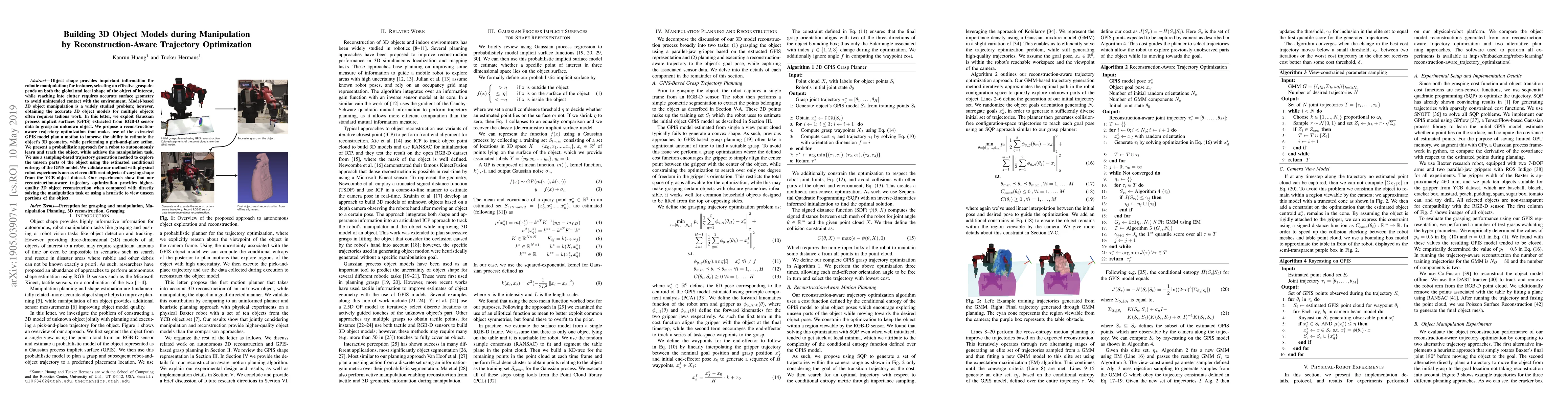 This paper proposes a method for robotic manipulation that builds 3D object models during manipulation using Gaussian process implicit surfaces (GPIS) and reconstruction-aware trajectory optimization. The approach autonomously learns and reconstructs the object's geometry while performing pick-and-place tasks, validated through experiments on various objects.