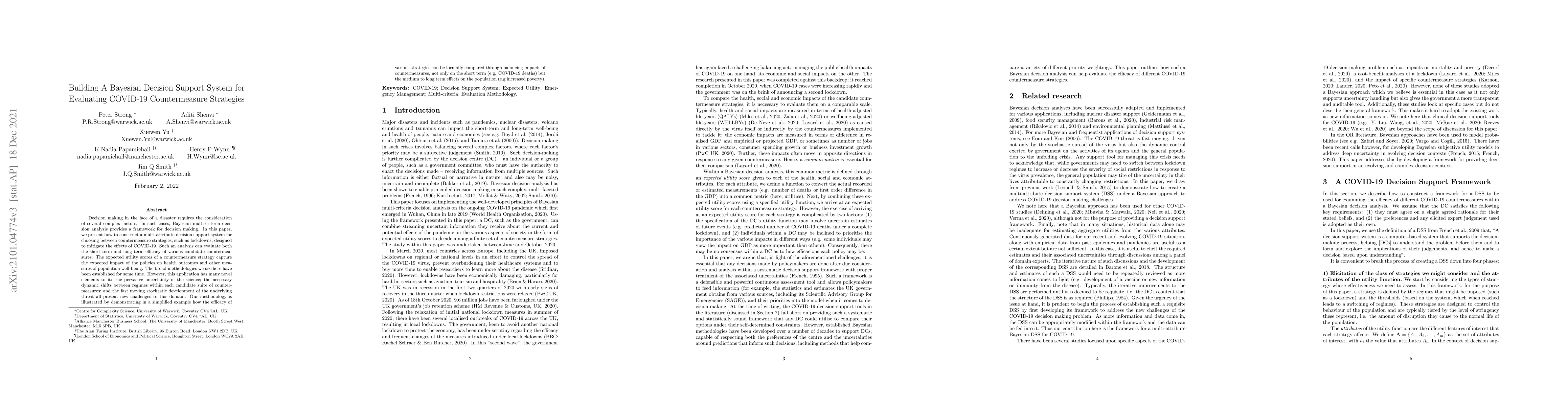 Decision making in the face of a disaster requires the consideration of several complex factors. In such cases, Bayesian multi-criteria decision analysis provides a framework for decision making. In this paper, we present how to construct a multi-attribute decision support system for choosing between countermeasure strategies, such as lockdowns, designed to mitigate the effects of COVID-19. Such an analysis can evaluate both the short term and long term efficacy of various candidate countermeasures. The expected utility scores of a countermeasure strategy capture the expected impact of the policies on health outcomes and other measures of population well-being. The broad methodologies we use here have been established for some time. However, this application has many novel elements to it: the pervasive uncertainty of the science; the necessary dynamic shifts between regimes within each candidate suite of countermeasures; and the fast moving stochastic development of the underlying threat all present new challenges to this domain. Our methodology is illustrated by demonstrating in a simplified example how the efficacy of various strategies can be formally compared through balancing impacts of countermeasures, not only on the short term (e.g. COVID-19 deaths) but the medium to long term effects on the population (e.g increased poverty).