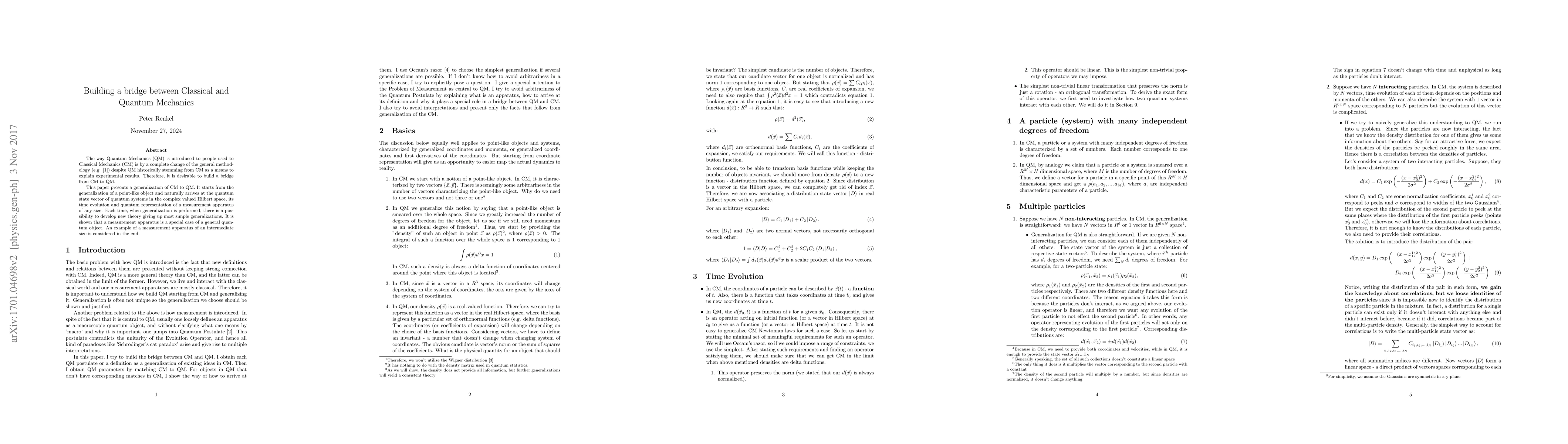 The way Quantum Mechanics (QM) is introduced to people used to Classical Mechanics (CM) is by a complete change of the general methodology) despite QM historically stemming from CM as a means to explain experimental results. Therefore, it is desirable to build a bridge from CM to QM. This paper presents a generalization of CM to QM. It starts from the generalization of a point-like object and naturally arrives at the quantum state vector of quantum systems in the complex valued Hilbert space, its time evolution and quantum representation of a measurement apparatus of any size. Each time, when generalization is performed, there is a possibility to develop new theory giving up most simple generalizations. It is shown that a measurement apparatus is a special case of a general quantum object. An example of a measurement apparatus of an intermediate size is considered in the end.