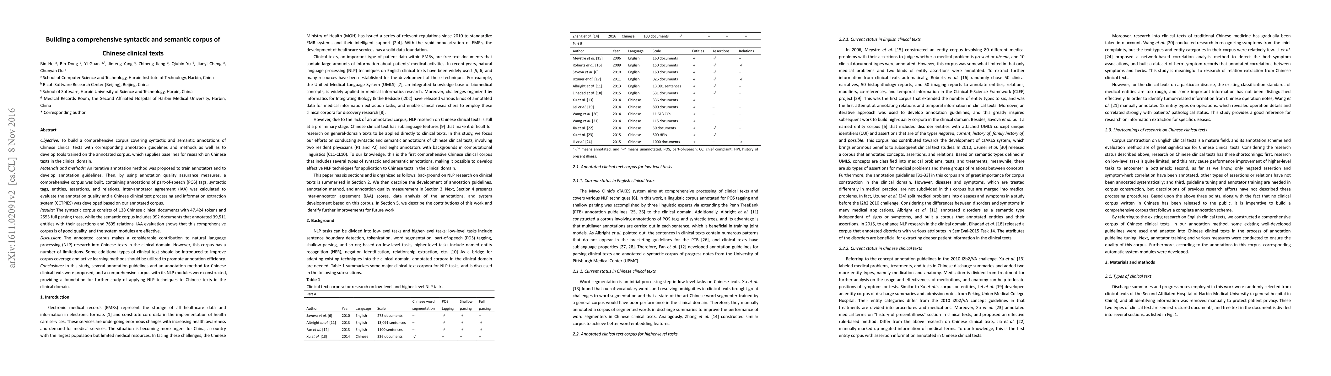This study developed a comprehensive syntactic and semantic corpus of Chinese clinical texts, annotated with part-of-speech tags, syntactic tags, entities, assertions, and relations, demonstrating high inter-annotator agreement. The corpus and accompanying processing system serve as a foundation for natural language processing research in the clinical domain.