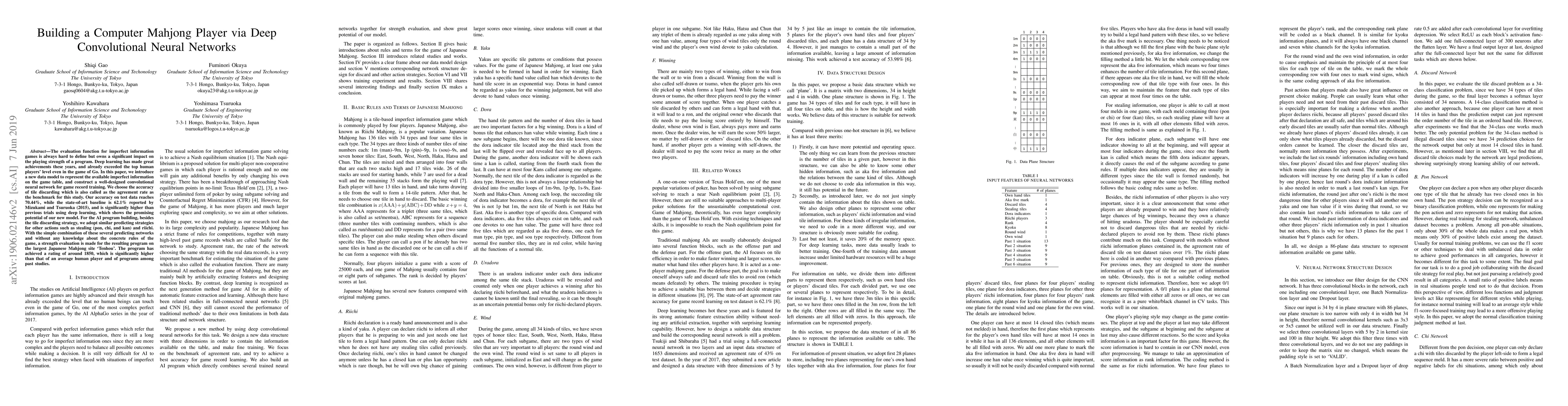 This paper develops a Mahjong player using deep convolutional neural networks, achieving a 70.44% agreement rate on tile discarding, surpassing previous deep learning methods. The AI also demonstrates competitive strength on a major Mahjong platform, with a rating above average human players.