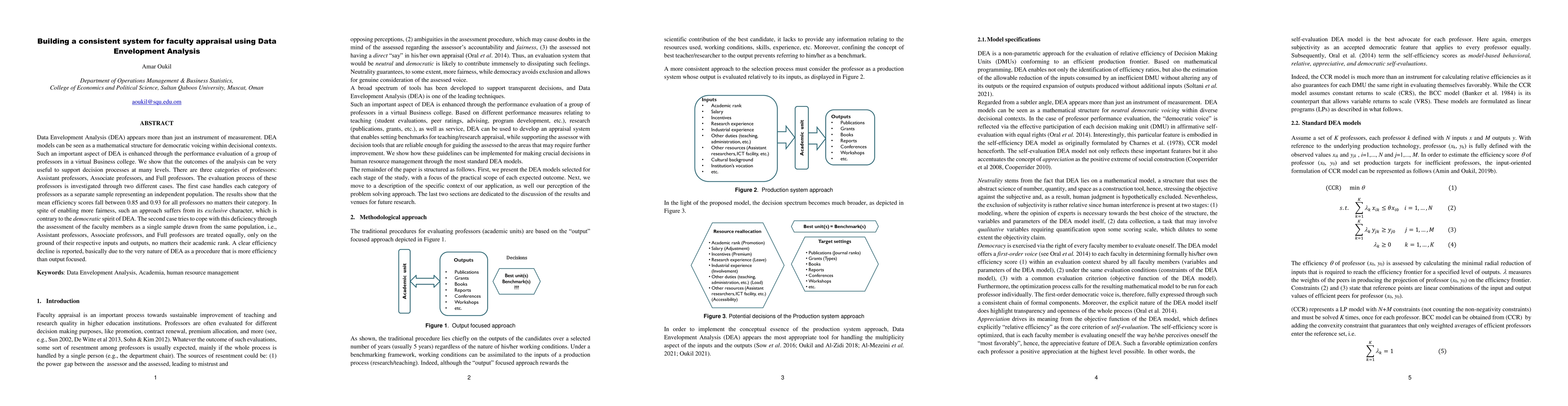 Data Envelopment Analysis (DEA) appears more than just an instrument of measurement. DEA models can be seen as a mathematical structure for democratic voicing within decisional contexts. Such an important aspect of DEA is enhanced through the performance evaluation of a group of professors in a virtual Business college. We show that the outcomes of the analysis can be very useful to support decision processes at many levels. There are three categories of professors: Assistant professors, Associate professors, and Full professors. The evaluation process of these professors is investigated through two different cases. The first case handles each category of professors as a separate sample representing an independent population. The results show that the mean efficiency scores fall between 0.85 and 0.93 for all professors no matters their category. In spite of enabling more fairness, such an approach suffers from its exclusive character, which is contrary to the democratic spirit of DEA. The second case tries to cope with this deficiency through the assessment of the faculty members as a single sample drawn from the same population, i.e., Assistant professors, Associate professors, and Full professors are treated equally, only on the ground of their respective inputs and outputs, no matters their academic rank. A clear efficiency decline is reported, basically due to the very nature of DEA as a procedure that is more efficiency than output focused.