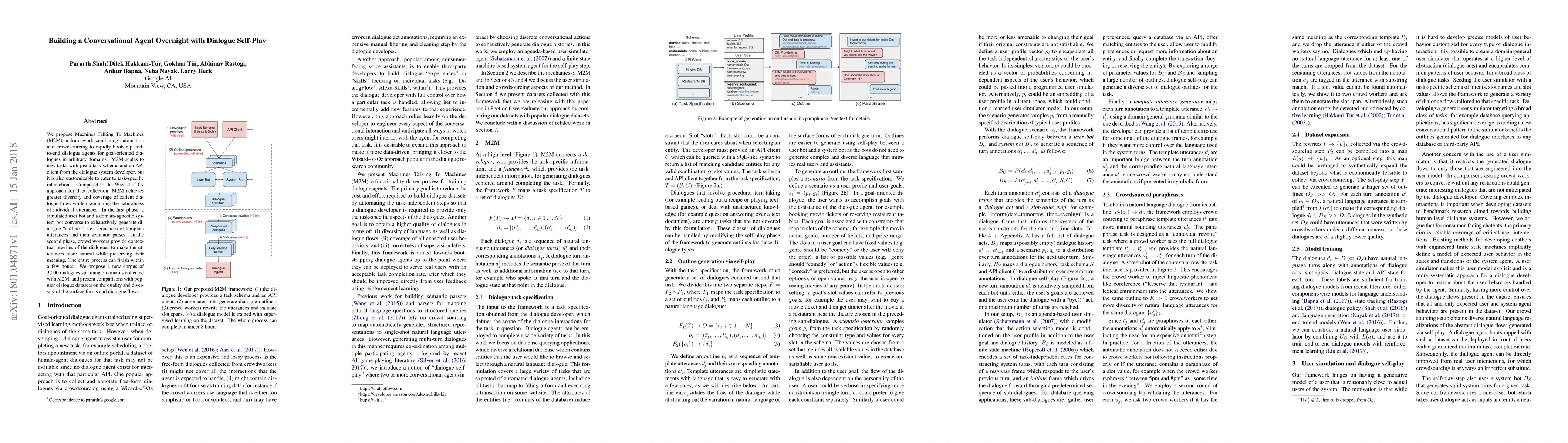 We propose Machines Talking To Machines (M2M), a framework combining automation and crowdsourcing to rapidly bootstrap end-to-end dialogue agents for goal-oriented dialogues in arbitrary domains. M2M scales to new tasks with just a task schema and an API client from the dialogue system developer, but it is also customizable to cater to task-specific interactions. Compared to the Wizard-of-Oz approach for data collection, M2M achieves greater diversity and coverage of salient dialogue flows while maintaining the naturalness of individual utterances. In the first phase, a simulated user bot and a domain-agnostic system bot converse to exhaustively generate dialogue "outlines", i.e. sequences of template utterances and their semantic parses. In the second phase, crowd workers provide contextual rewrites of the dialogues to make the utterances more natural while preserving their meaning. The entire process can finish within a few hours. We propose a new corpus of 3,000 dialogues spanning 2 domains collected with M2M, and present comparisons with popular dialogue datasets on the quality and diversity of the surface forms and dialogue flows.