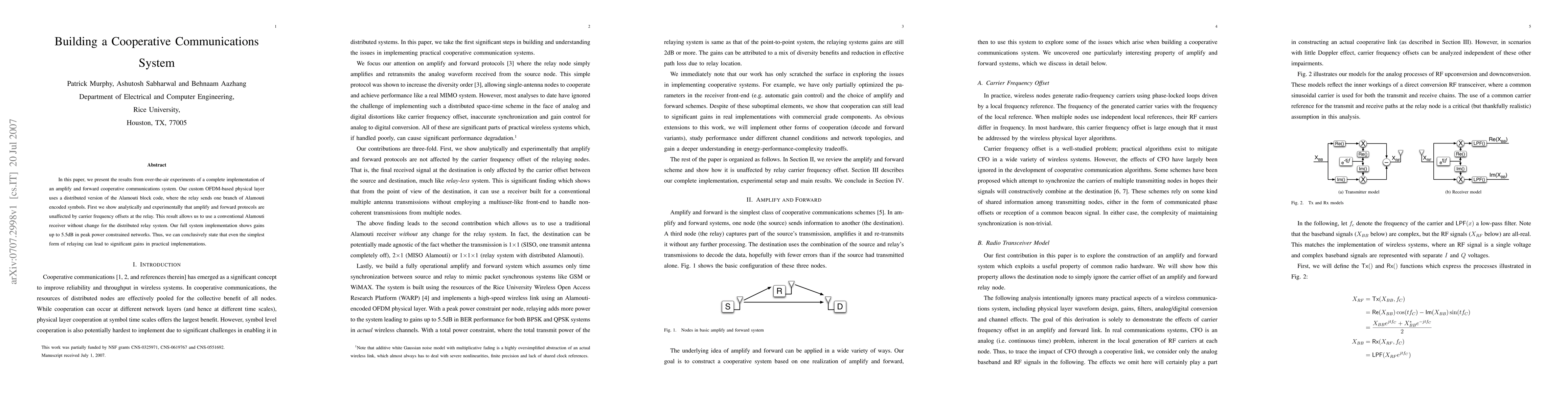 In this paper, we present the results from over-the-air experiments of a complete implementation of an amplify and forward cooperative communications system. Our custom OFDM-based physical layer uses a distributed version of the Alamouti block code, where the relay sends one branch of Alamouti encoded symbols. First we show analytically and experimentally that amplify and forward protocols are unaffected by carrier frequency offsets at the relay. This result allows us to use a conventional Alamouti receiver without change for the distributed relay system. Our full system implementation shows gains up to 5.5dB in peak power constrained networks. Thus, we can conclusively state that even the simplest form of relaying can lead to significant gains in practical implementations.
