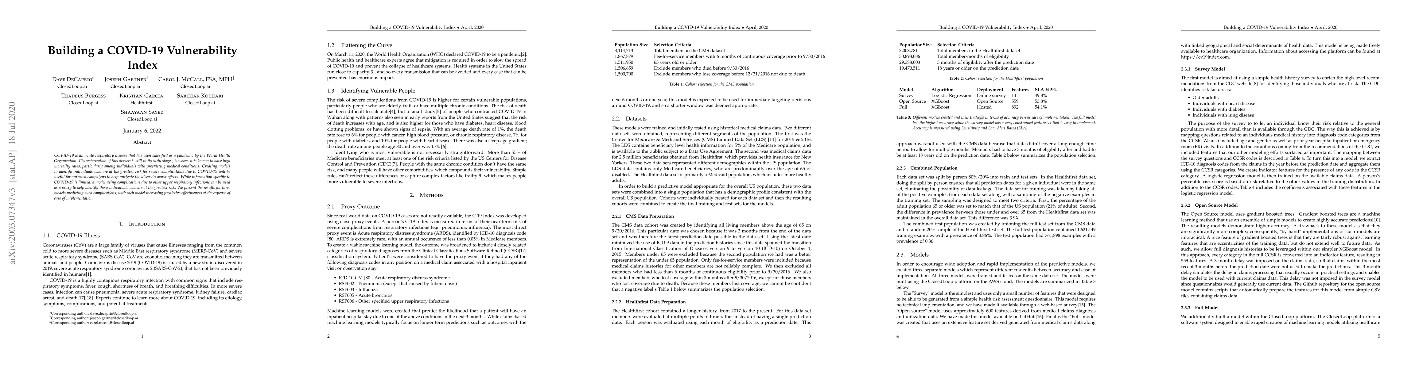 Researchers developed a COVID-19 vulnerability index to identify individuals at high risk for severe complications. The models predict complications from upper respiratory infections as a proxy, increasing predictive effectiveness but requiring trade-offs in ease of implementation.