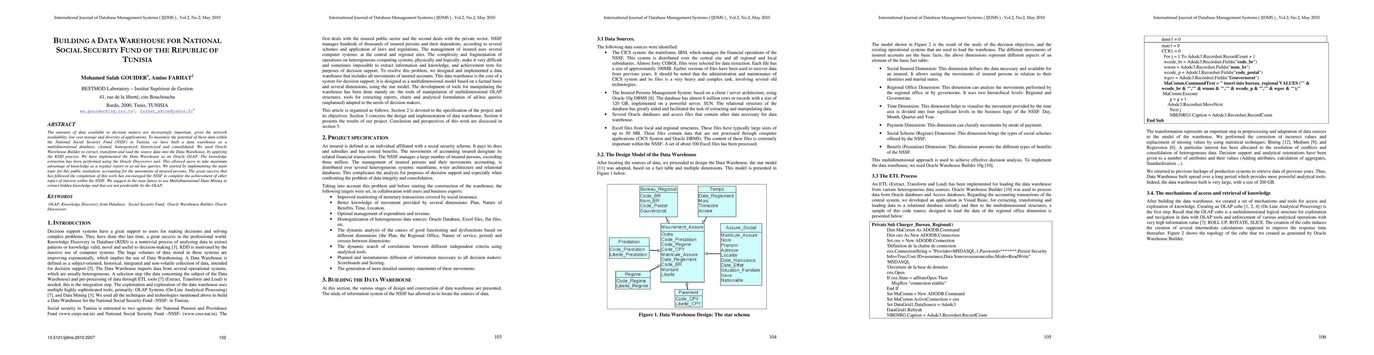 The amounts of data available to decision makers are increasingly important, given the network availability, low cost storage and diversity of applications. To maximize the potential of these data within the National Social Security Fund (NSSF) in Tunisia, we have built a data warehouse as a multidimensional database, cleaned, homogenized, historicized and consolidated. We used Oracle Warehouse Builder to extract, transform and load the source data into the Data Warehouse, by applying the KDD process. We have implemented the Data Warehouse as an Oracle OLAP. The knowledge extraction has been performed using the Oracle Discoverer tool. This allowed users to take maximum advantage of knowledge as a regular report or as ad hoc queries. We started by implementing the main topic for this public institution, accounting for the movements of insured persons. The great success that has followed the completion of this work has encouraged the NSSF to complete the achievement of other topics of interest within the NSSF. We suggest in the near future to use Multidimensional Data Mining to extract hidden knowledge and that are not predictable by the OLAP.