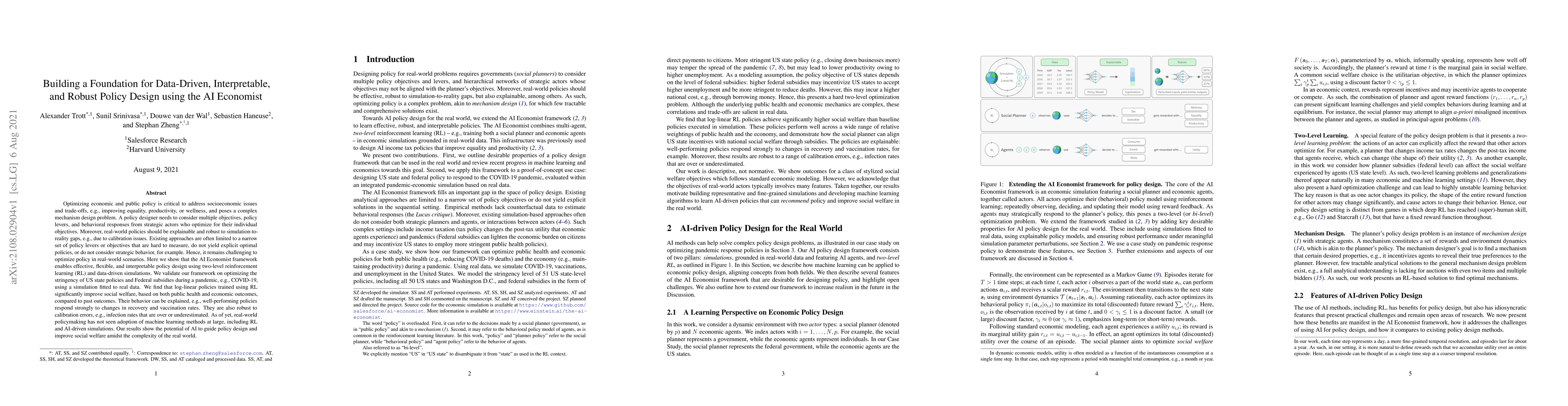This paper proposes an AI Economist framework using two-level reinforcement learning to design interpretable and robust economic policies. The framework optimizes social welfare by balancing public health and economic outcomes, demonstrating effectiveness through simulations of US state policies during the COVID-19 pandemic.