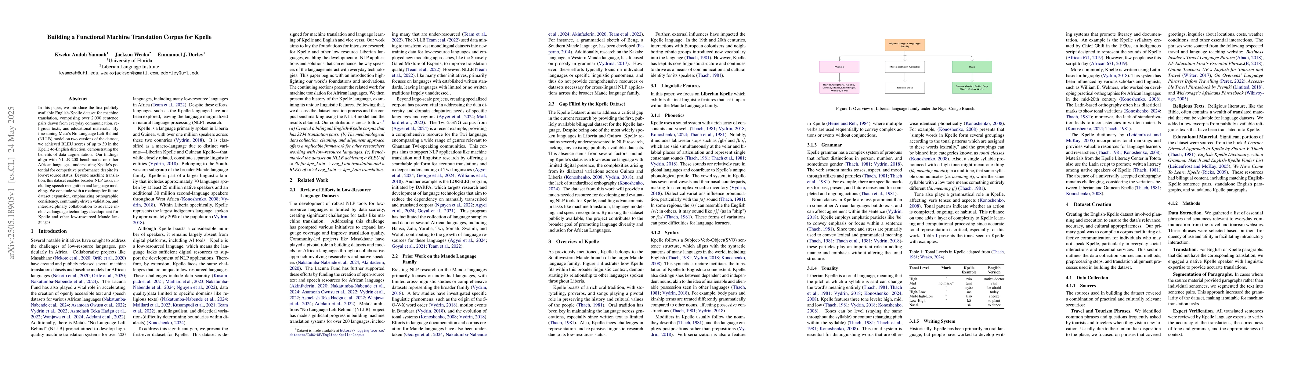 Development of a functional machine translation corpus for Kpelle, along with fine-tuning strategies for low-resource languages using the NLLB model.