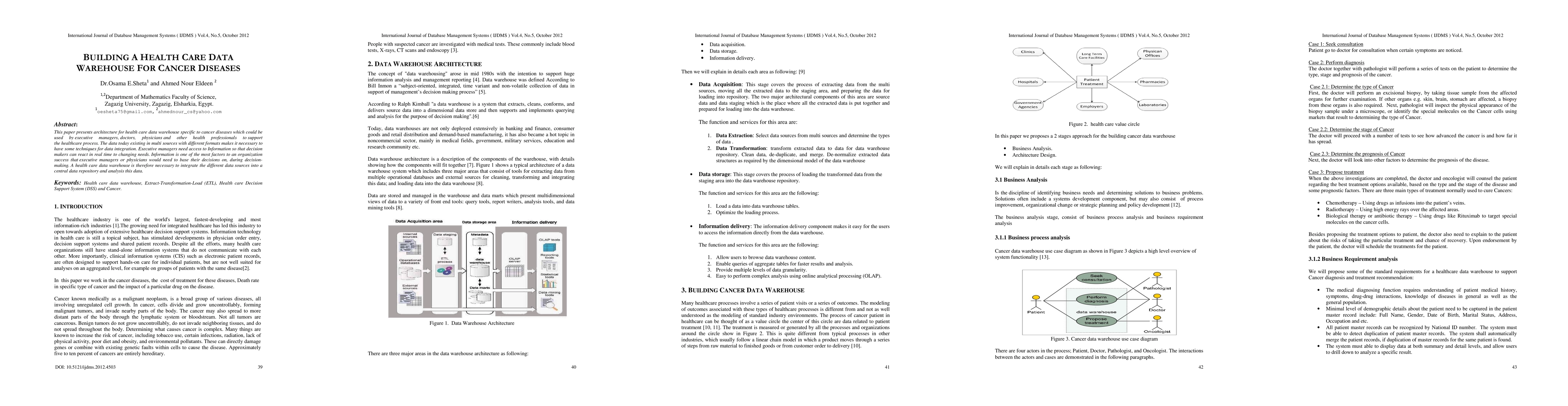 This paper outlines the architecture for a specialized health care data warehouse for cancer diseases, designed to integrate multi-source data into a central repository for real-time decision-making support by executive managers and health professionals. The data warehouse aims to facilitate timely and informed decision-making in healthcare.