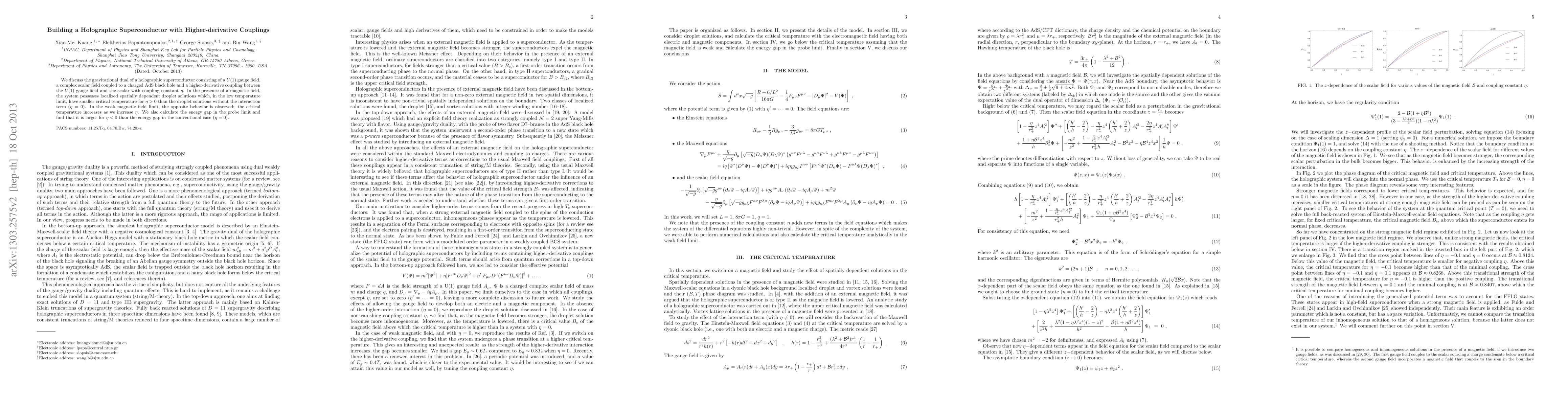 We discuss the gravitational dual of a holographic superconductor consisting of a U(1) gauge field, a complex scalar field coupled to a charged AdS black hole and a higher-derivative coupling between the U(1) gauge field and the scalar with coupling constant \eta. In the presence of a magnetic field, the system possesses localized spatially dependent droplet solutions which, in the low temperature limit, have smaller critical temperature for \eta>0 than the droplet solutions without the interaction term (\eta=0). In the weak magnetic field limit, the opposite behavior is observed: the critical temperature increases as we increase \eta. We also calculate the energy gap in the probe limit and find that it is larger for \eta<0 than the energy gap in the conventional case (\eta=0).