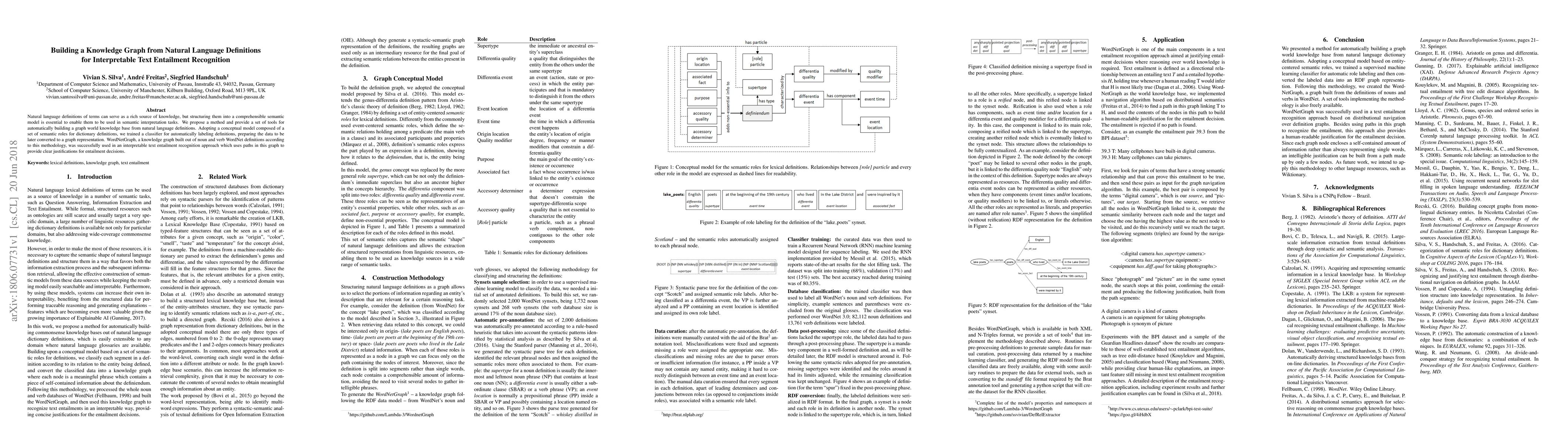 This paper proposes a method to automatically construct a knowledge graph from natural language definitions, using a classifier to label definitions and convert them into a graph representation. The resulting WordNetGraph is utilized in an interpretable text entailment recognition system, providing clear justifications for entailment decisions through graph paths.