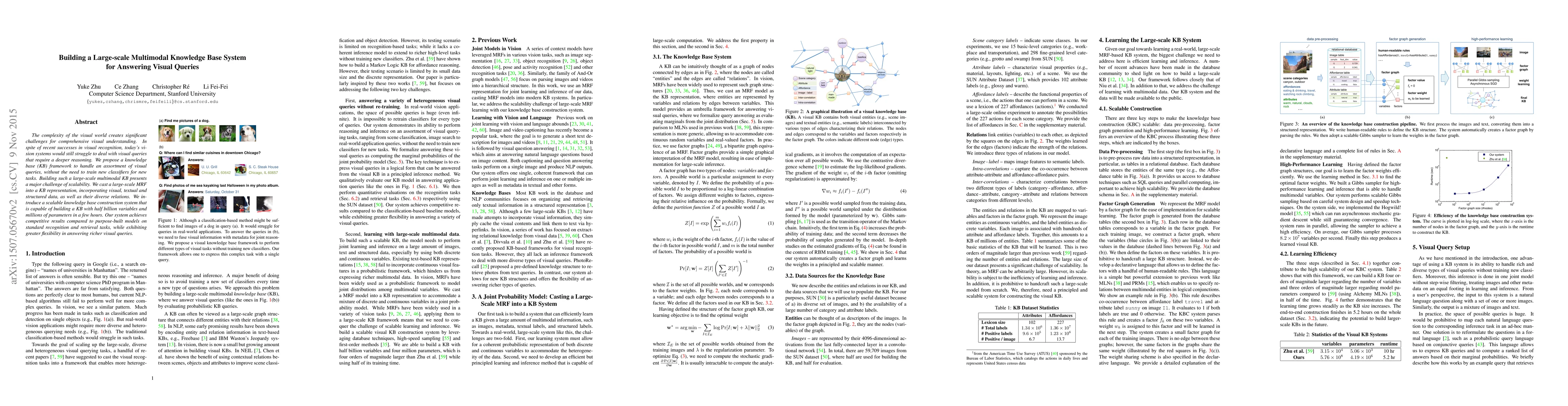 This paper proposes a scalable framework for constructing a large-scale multimodal knowledge base to answer complex visual queries, leveraging visual, textual, and structured data. The system efficiently builds a KB with half a billion variables, achieving competitive results on recognition tasks and demonstrating flexibility in handling diverse queries.