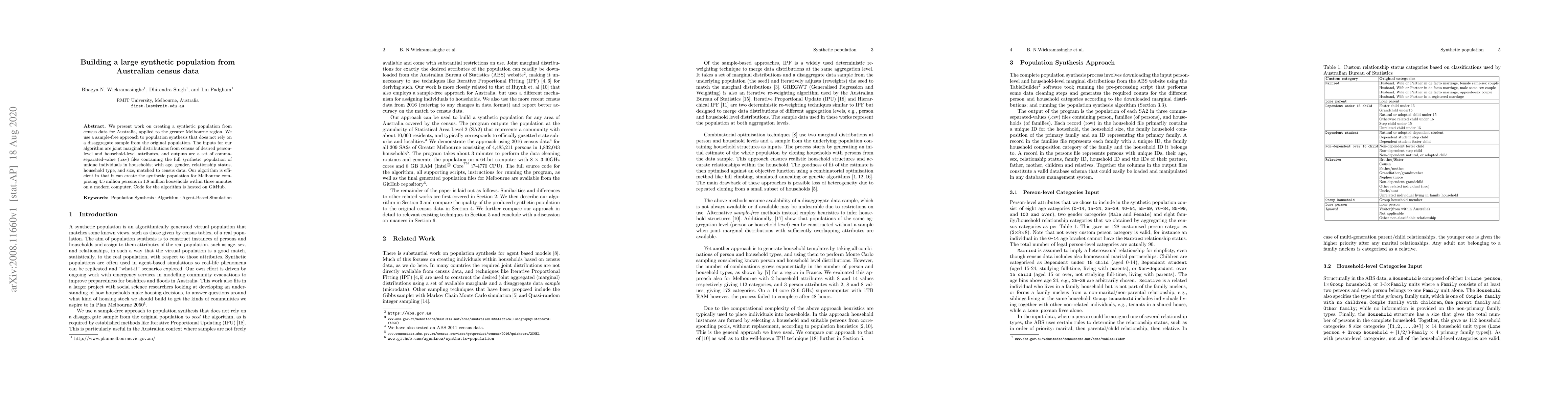 We present work on creating a synthetic population from census data for Australia, applied to the greater Melbourne region. We use a sample-free approach to population synthesis that does not rely on a disaggregate sample from the original population. The inputs for our algorithm are joint marginal distributions from census of desired person-level and household-level attributes, and outputs are a set of comma-separated-value (.csv) files containing the full synthetic population of unique individuals in households; with age, gender, relationship status, household type, and size, matched to census data. Our algorithm is efficient in that it can create the synthetic population for Melbourne comprising 4.5 million persons in 1.8 million households within three minutes on a modern computer. Code for the algorithm is hosted on GitHub.